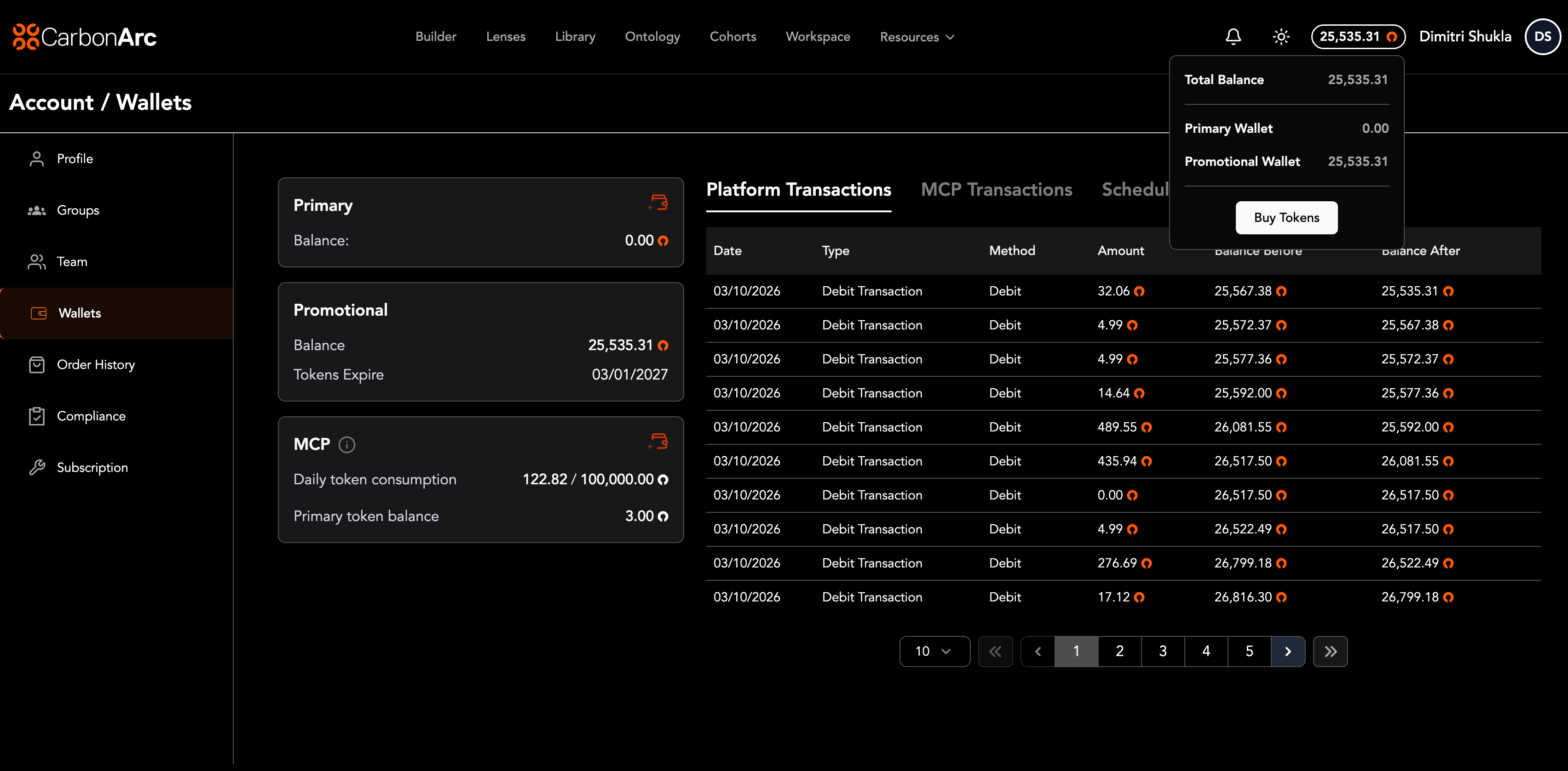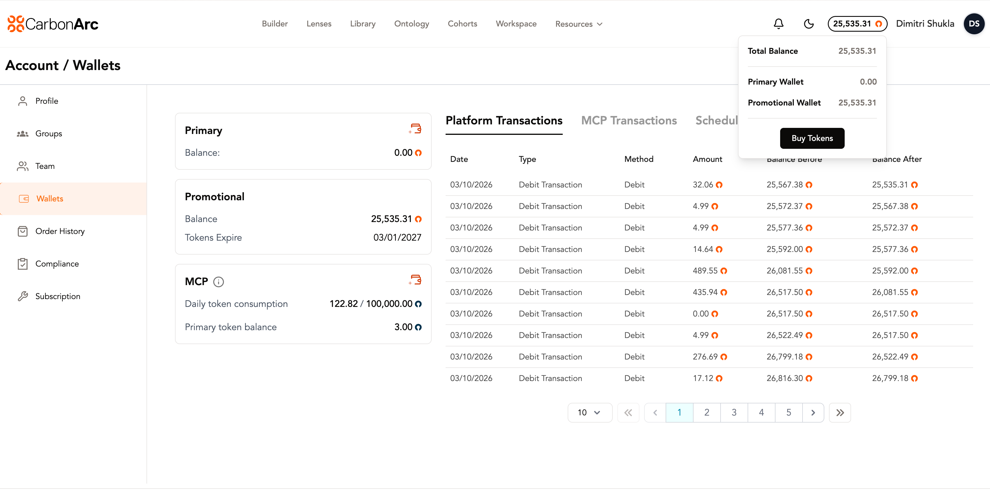 - Promotional Wallet — Tokens allocated monthly based on your subscription plan. Promotional Wallet tokens expire at the end of each month and are consumed first.