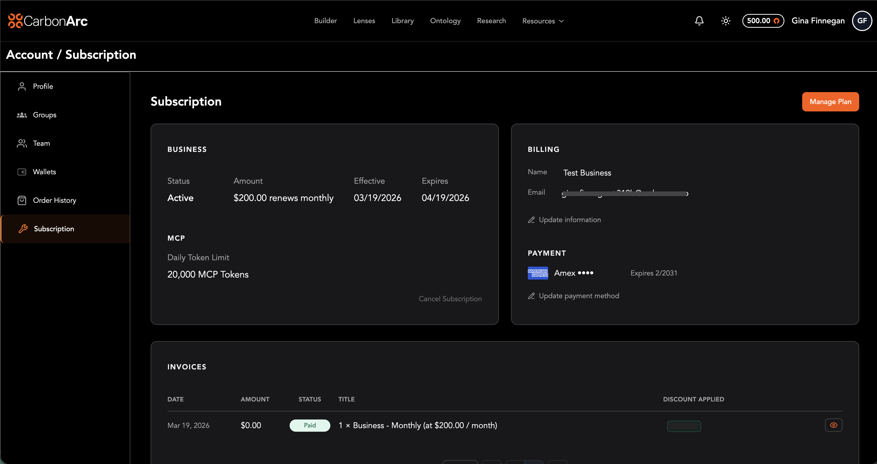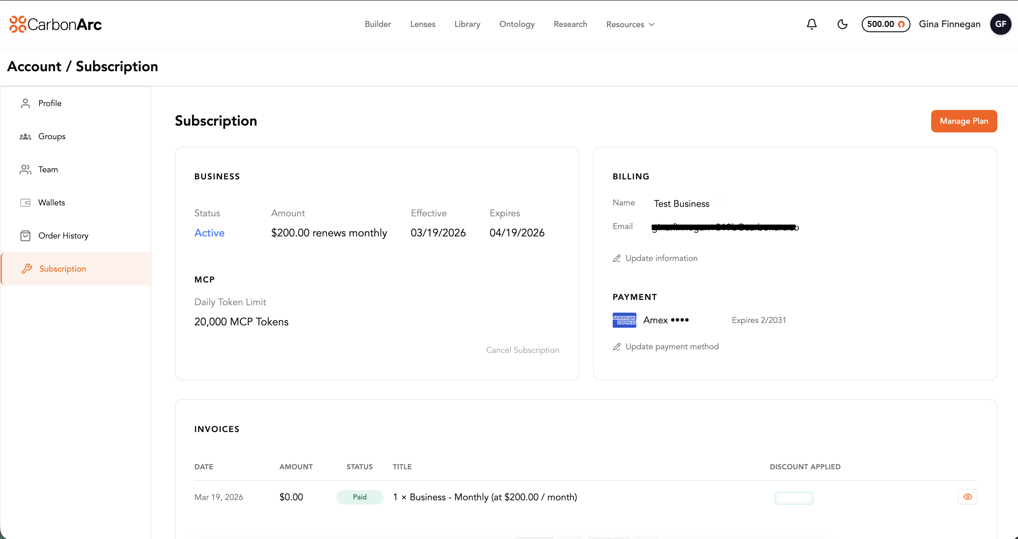 - Plan Name: The name of your current platform plan (e.g., Business).