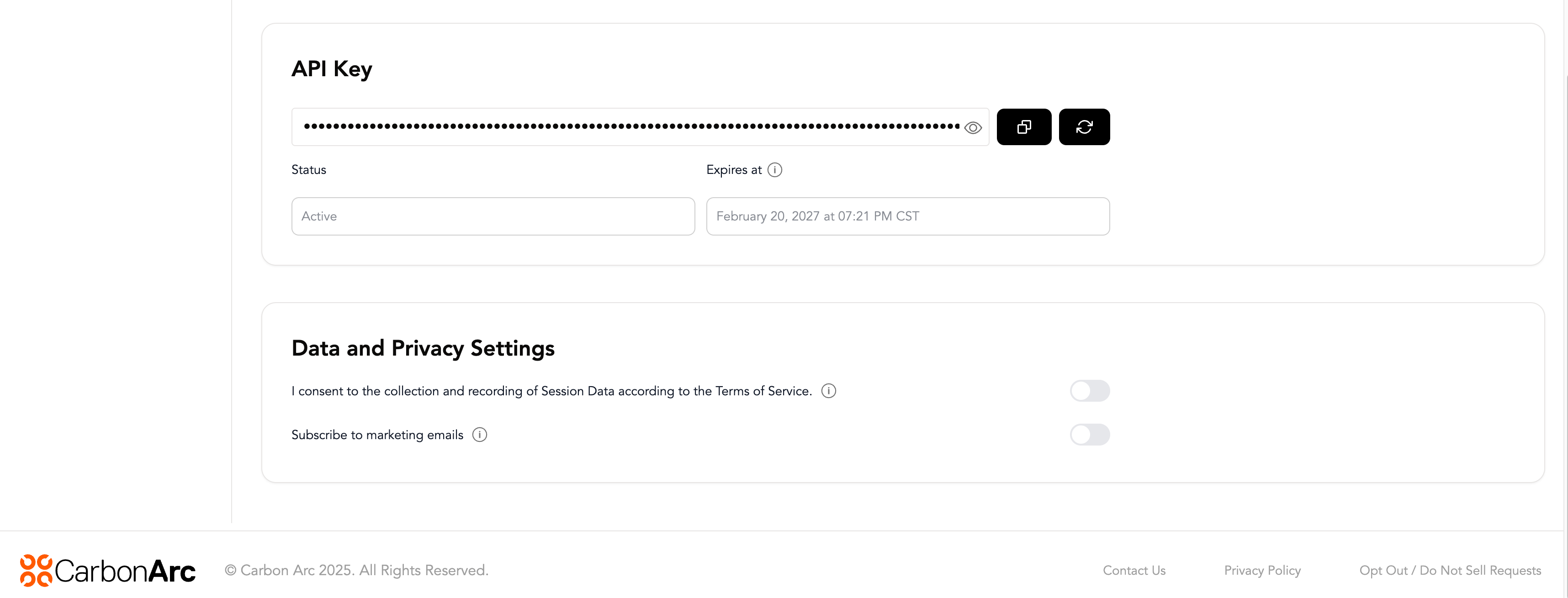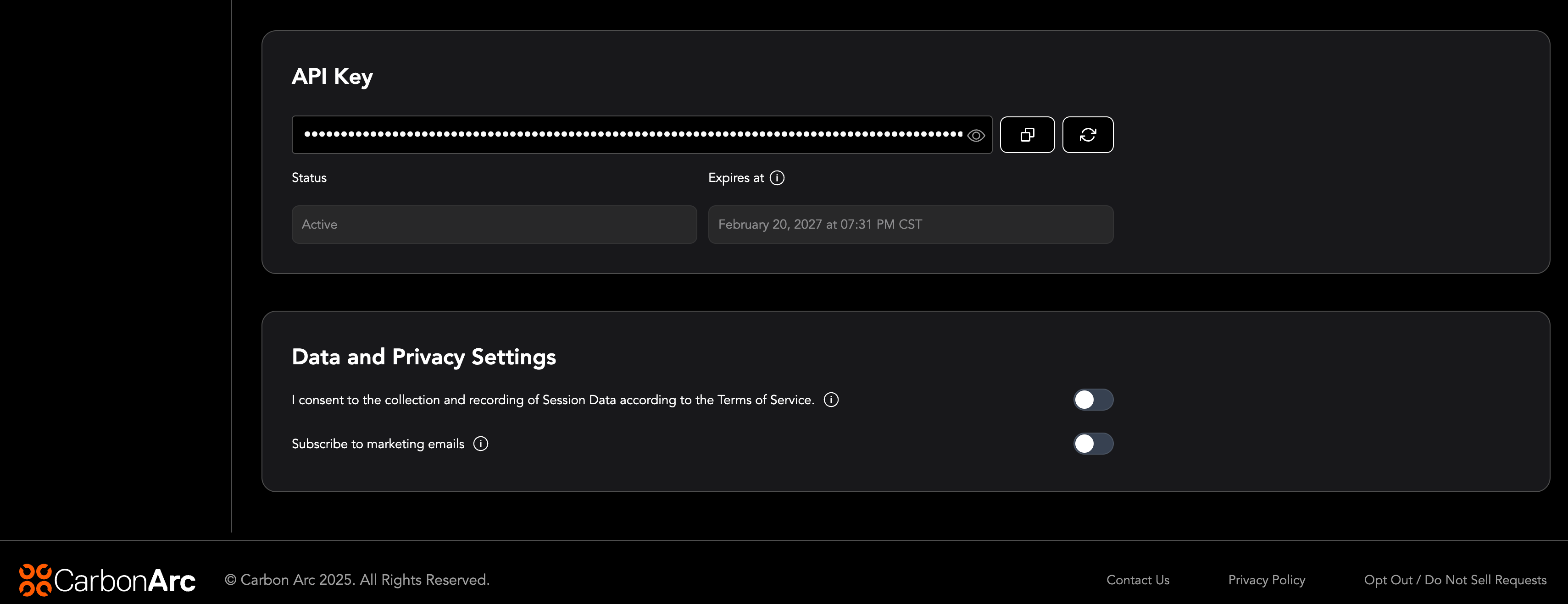 Your API key is used to securely authenticate access to Carbon Arc's infrastructure. For a step-by-step guide on locating and copying your key, see Access Your API Key.
