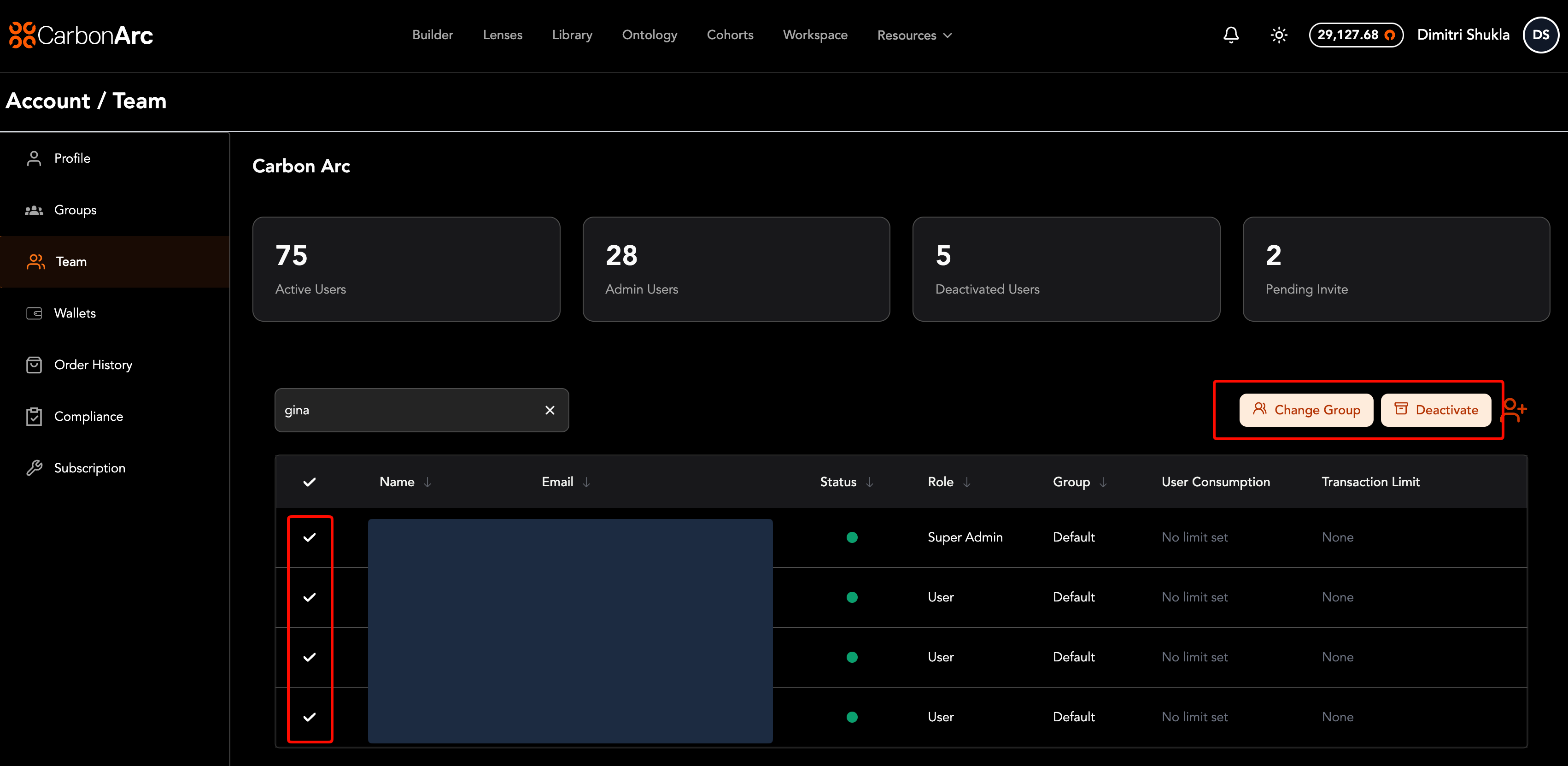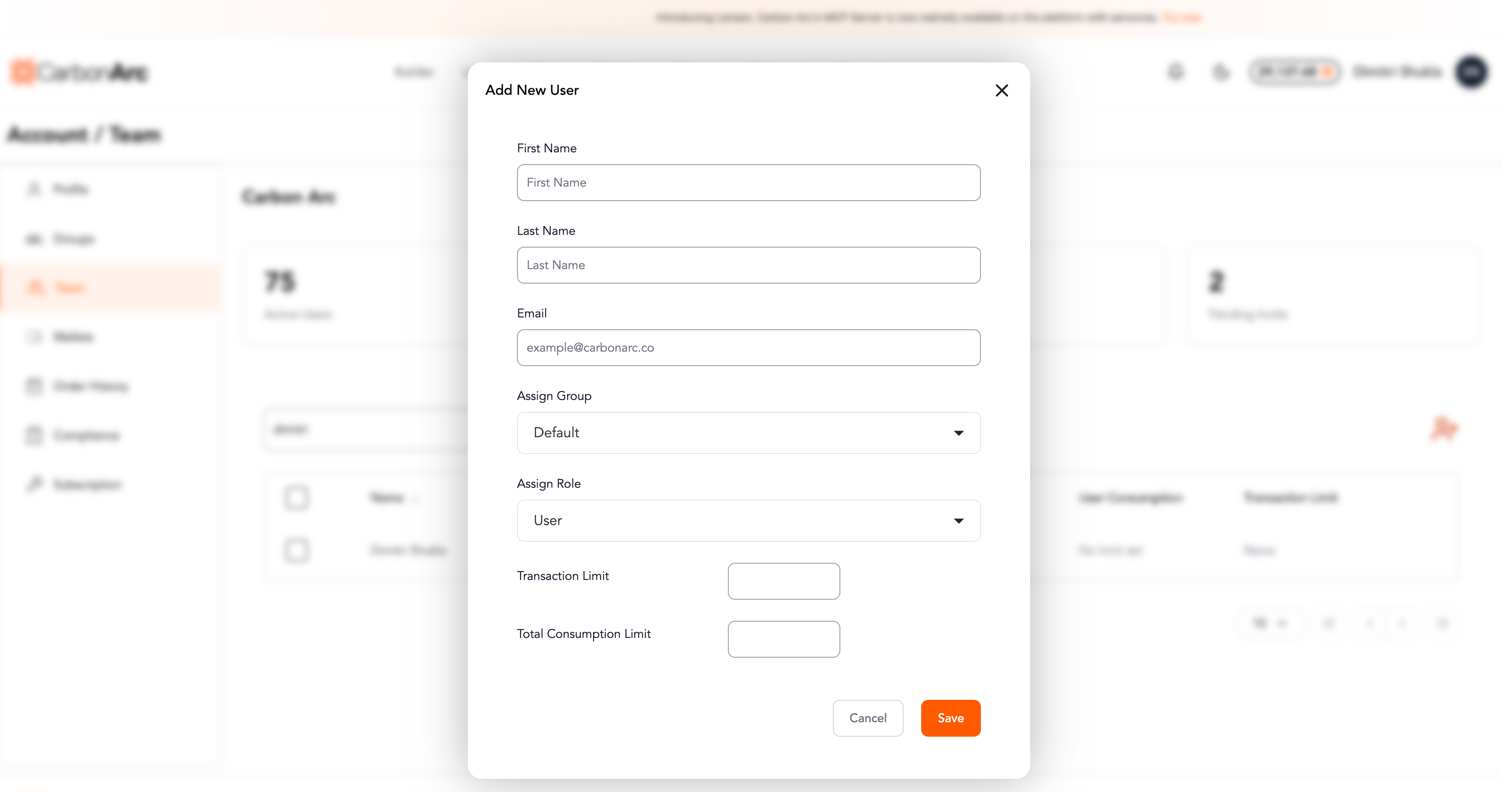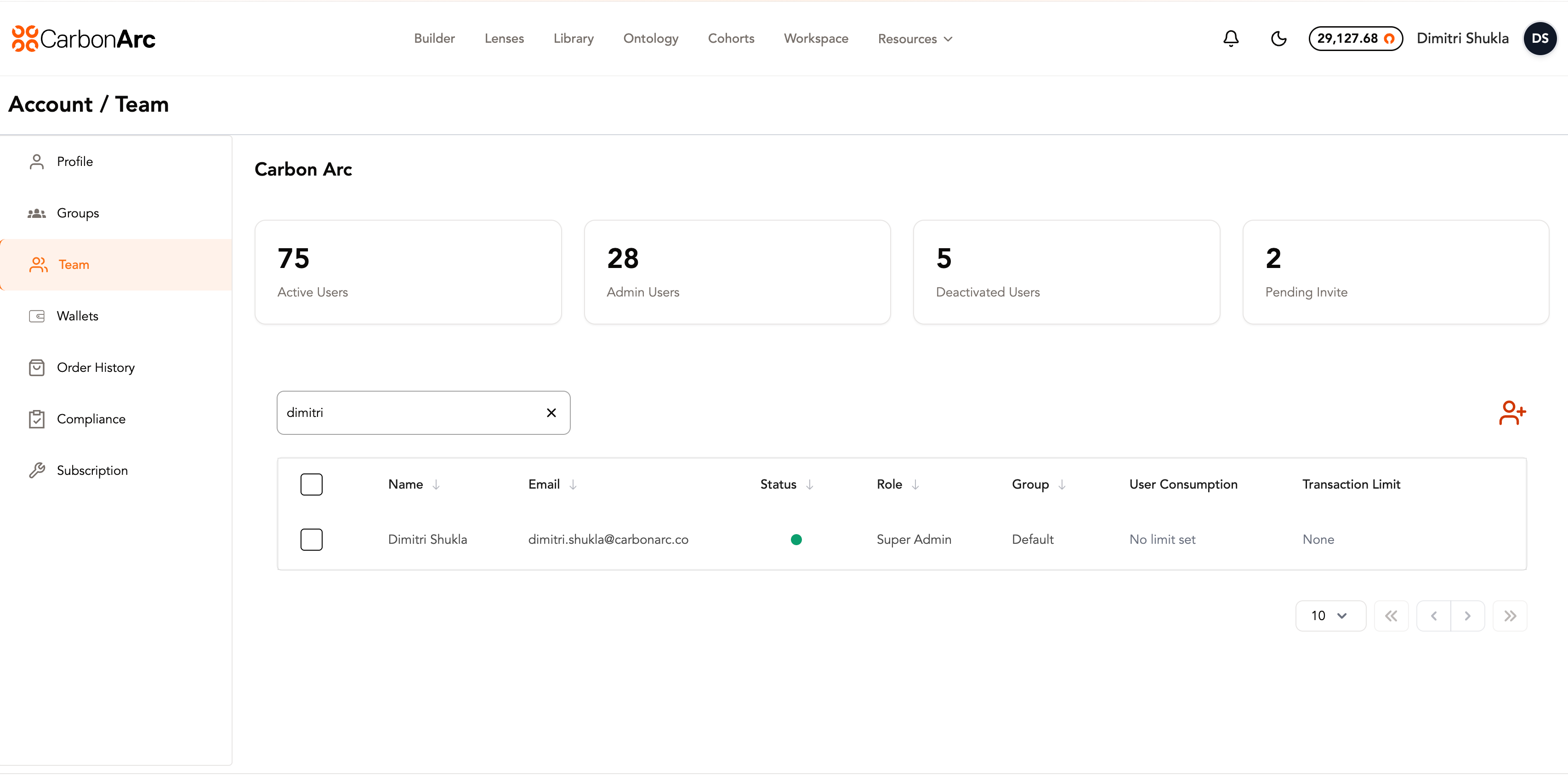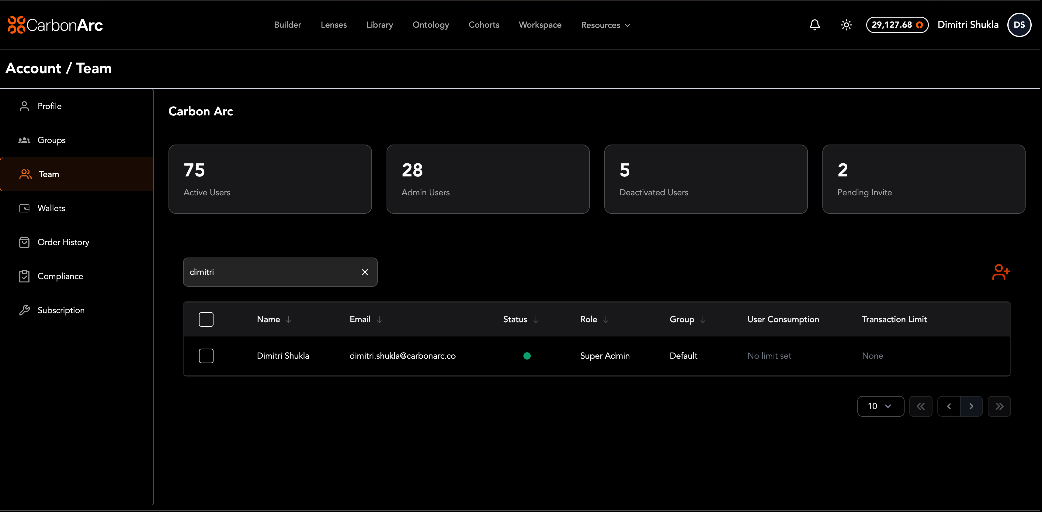 The Team page allows oversight into your organization’s team roster. Admins can manage users, assign roles and groups, and configure token spending limits.