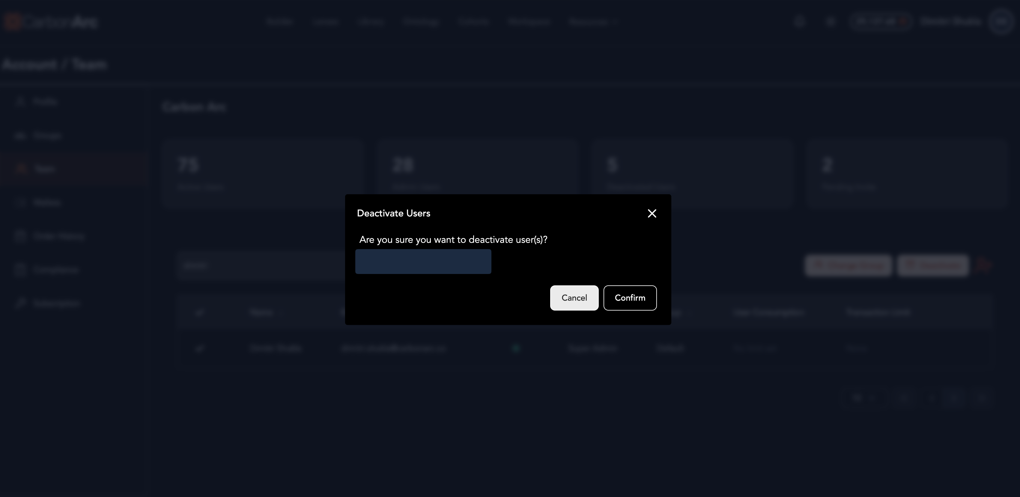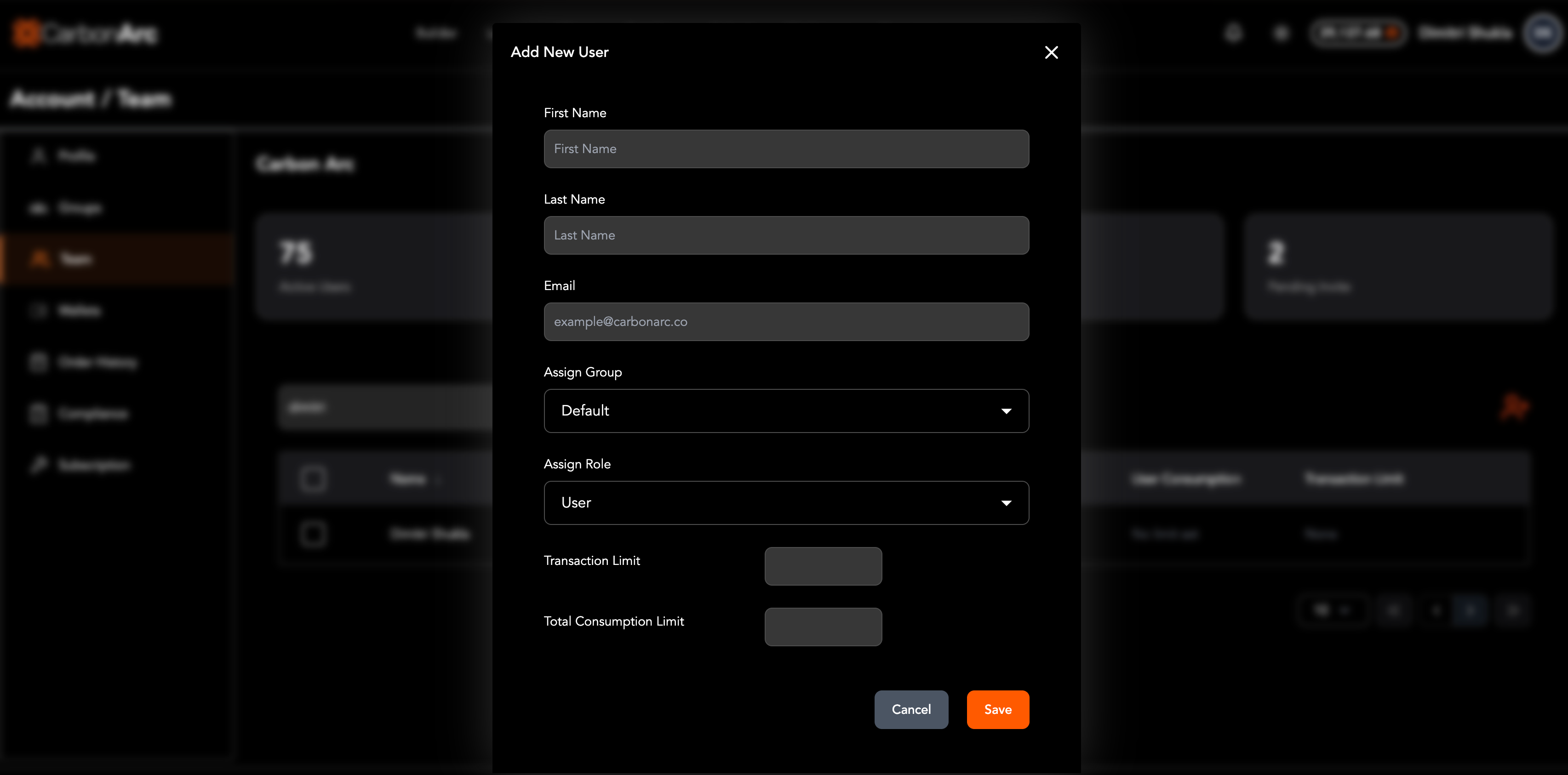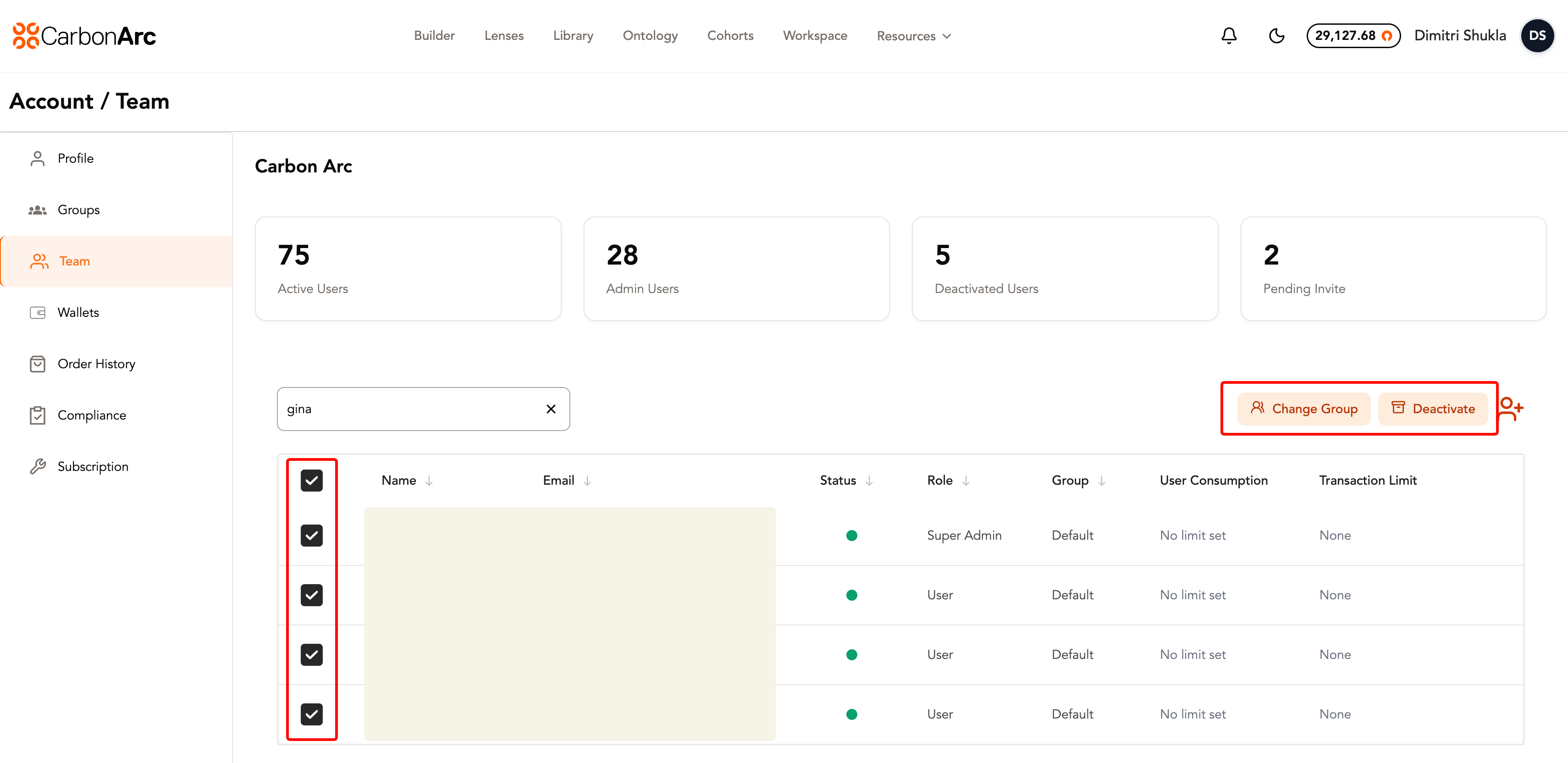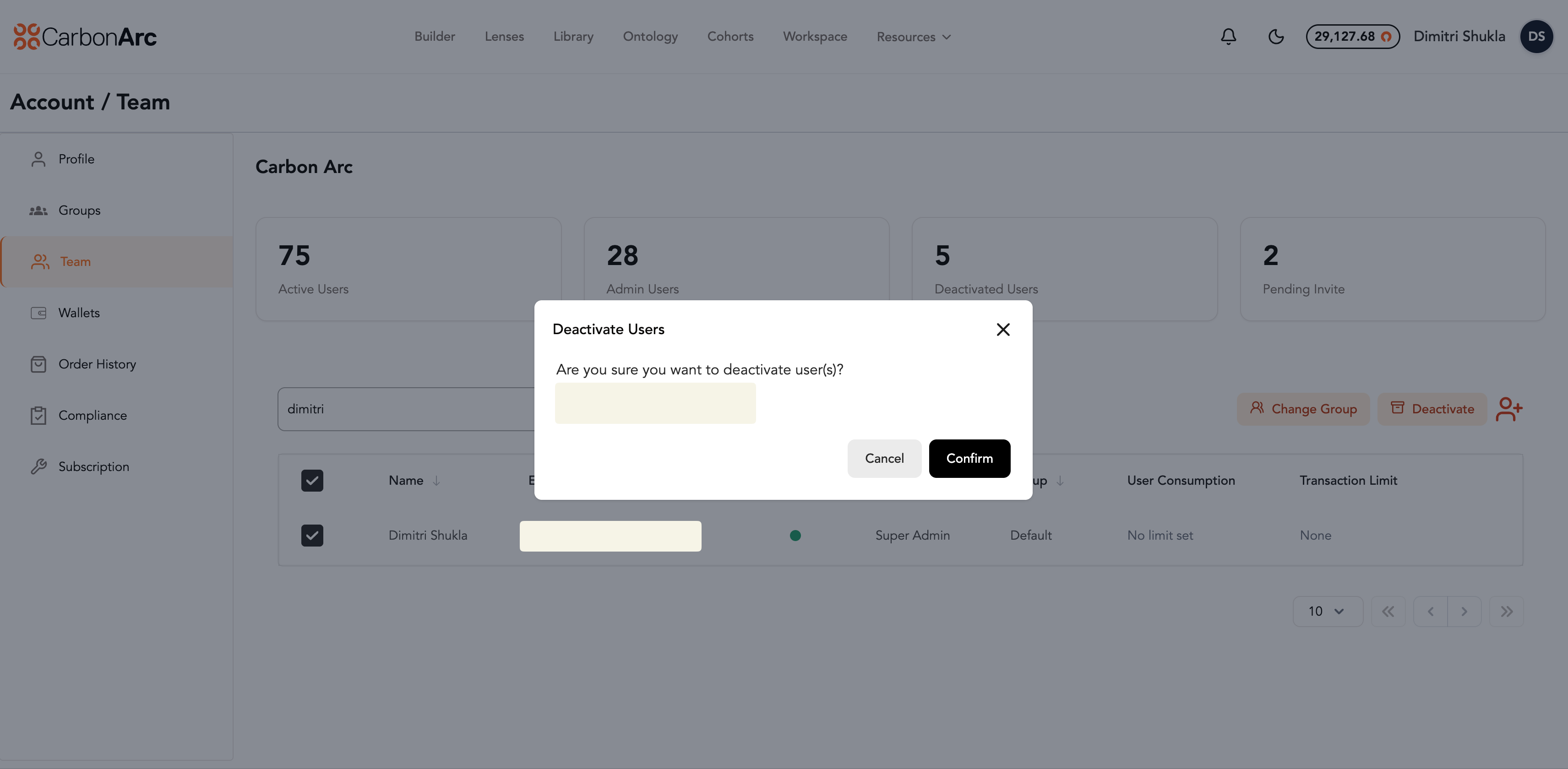 The Team page allows oversight into your organization’s team roster. Admins can manage users, assign roles and groups, and configure token spending limits.