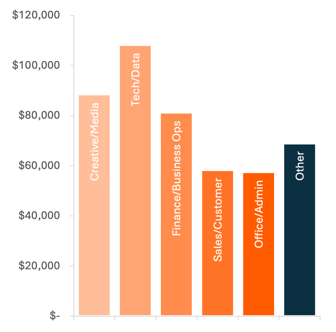 Data/technology roles have the highest salaries within at-risk roles, followed by creative/media positions.