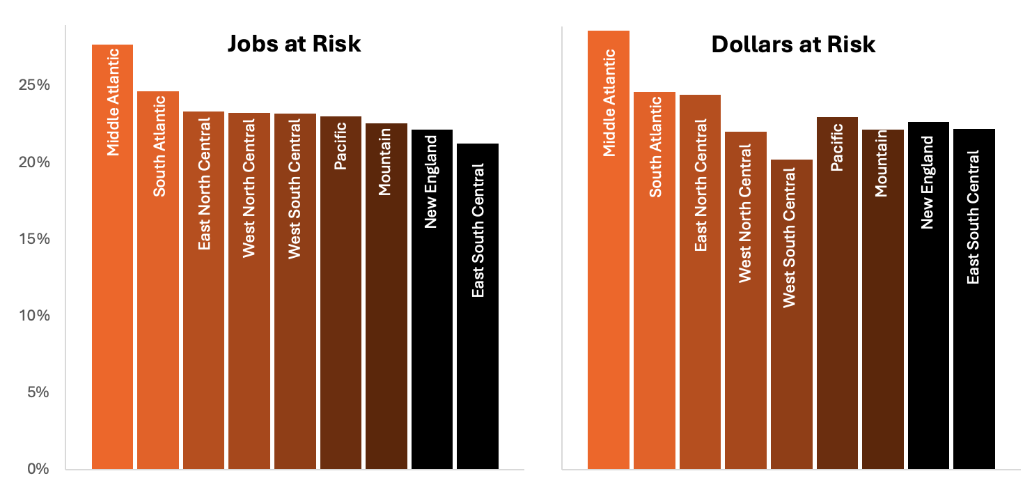 Regionally, Middle Atlantic states' economies have the largest exposure to at-risk roles and an even larger exposure via income. The West South Central has moderate job exposure, but low dollars at-risk.