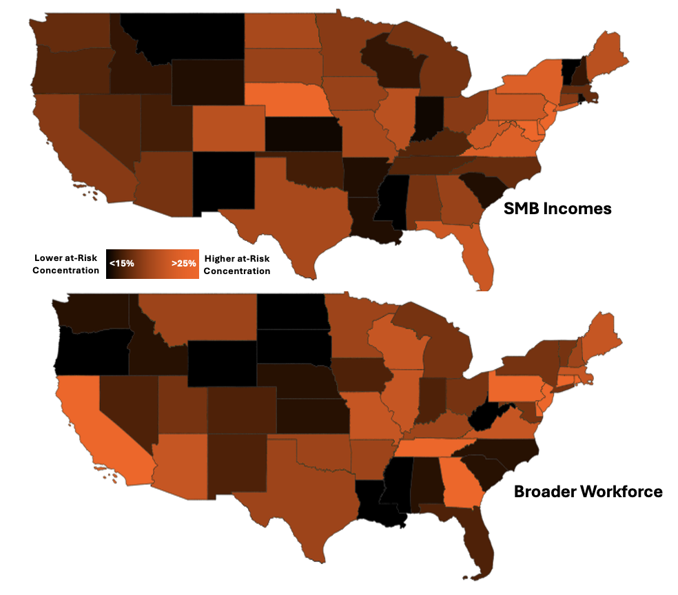 Small to mid-sized families and young to middle-aged earners have the highest exposure to at-risk positions. These at-risk incomes are more highly concentrated within Middle Atlantic states in the SMB workforce but have different regional demographics within the broader workforce.