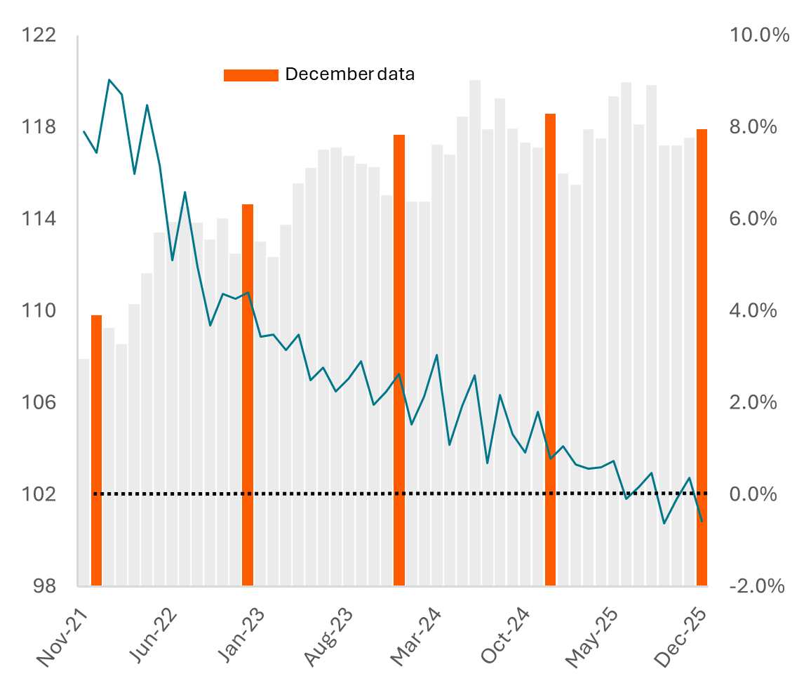 Exhibit 1: Monthly indexed SMB workforce (bars, left) and Y/Y change (line, right), December data in orange