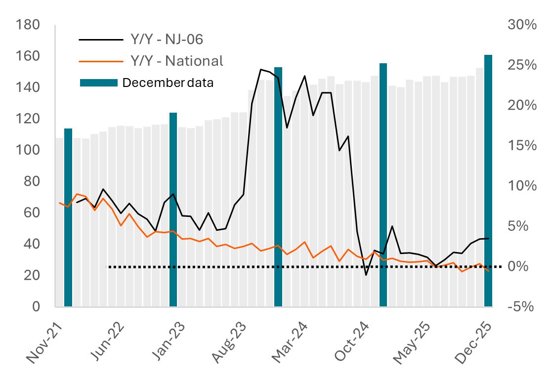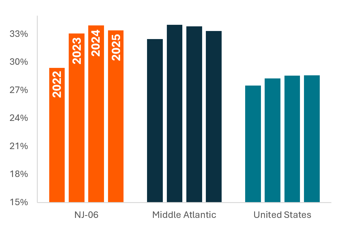 We use data on vehicle registrations to compare the mix of new vs. used vehicles as a relative measure of economic strength. Compared to the national level, or even the rest of the Middle Atlantic census division, NJ-06 had a sharp rise in the proportion of vehicle registrations that were new as its SMB workforce boomed in 2023 and again rose in 2024 before softening slightly in 2025. Average credit card transaction sizes and foot traffic per unique stores also provide measures of whether a strong SMB workforce is correlated with relative economic strength. At least in 2025, NJ-06’s SMB workforce growth did not translate into larger average ticket sizes or changes in foot traffic.