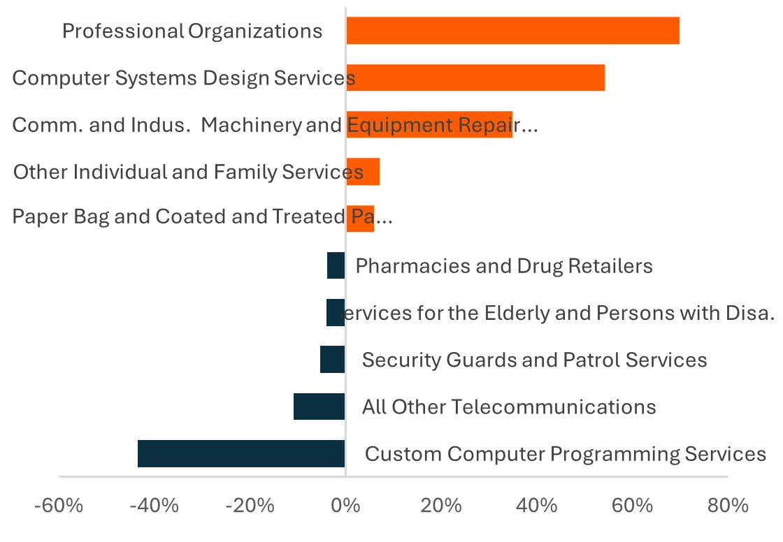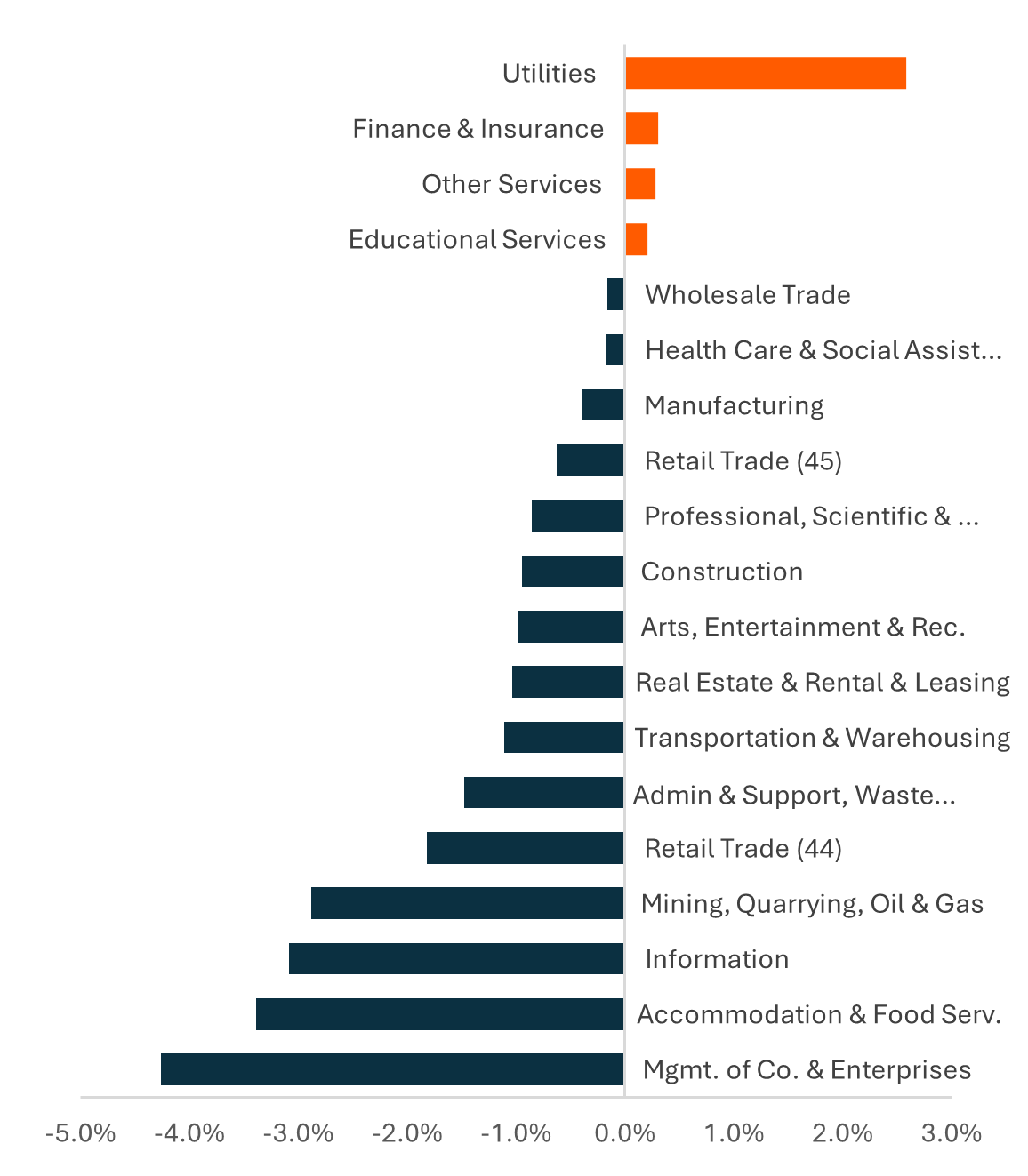 At the sector level, workforce expansion continued in 2025 within the Utilities, Finance & Insurance, and Other Services2 sectors, while Accommodation & Food Services and Information sectors experienced the largest contractions.