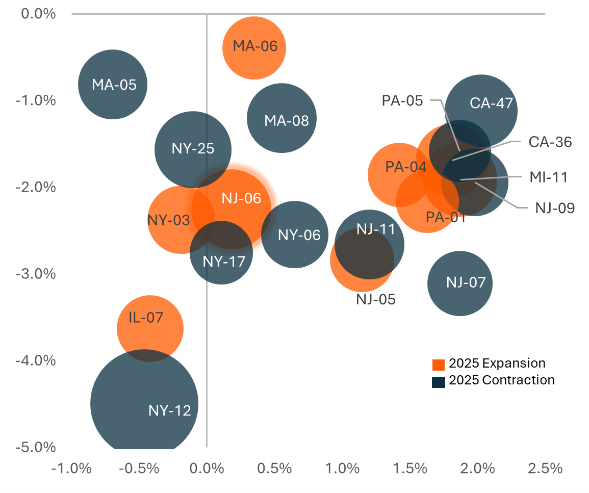 Congressional districts differ meaningfully in their industrial mix, workforce composition, and exposure to local policy decisions. Understanding how jobs are growing or contracting at the district level provides a clearer picture of where economic momentum may be building, where it is fading, and why. With economic growth often driving political change -- and midterm elections approaching – we’ve ranked congressional districts by SMB workforce growth or contraction in 2025.