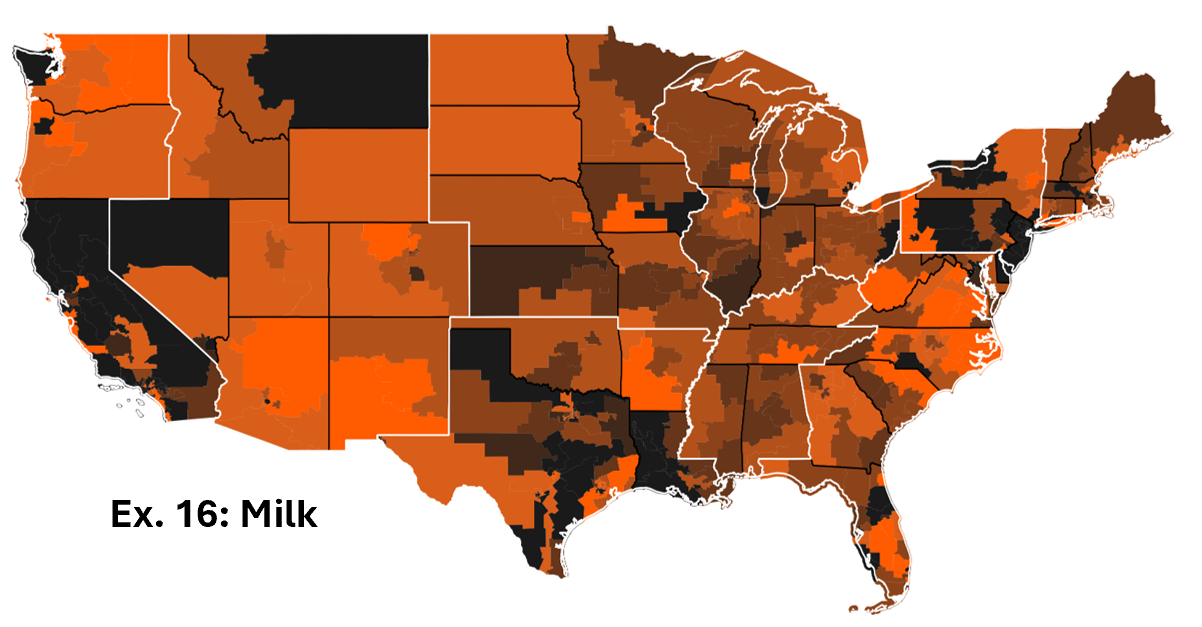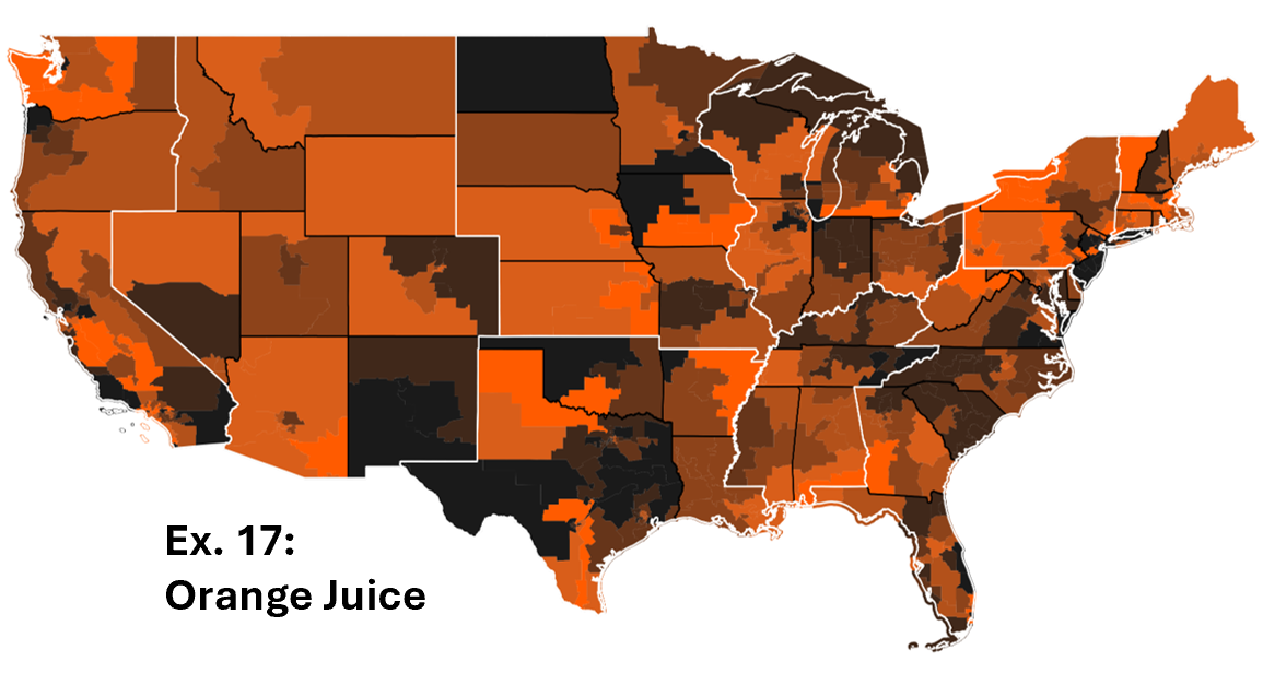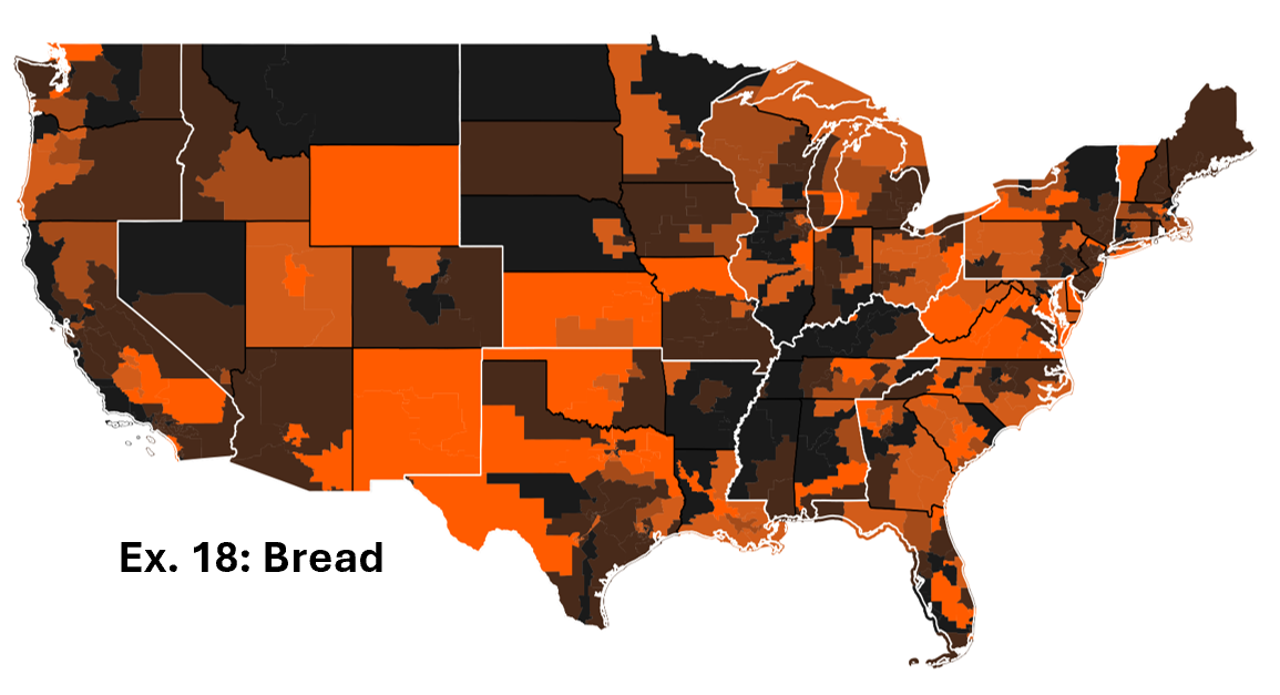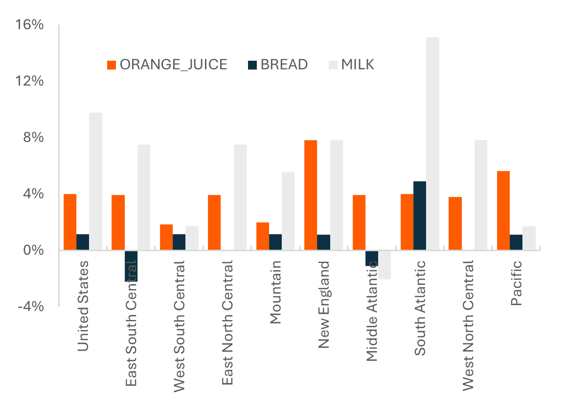 To complement our analysis of SMB workforce growth by congressional districts, we examined changes in the prices of everyday consumer staples—bread, milk, and orange juice—using point-of-sale transaction data at the zip code level, aggregated at the national, census division, and down to the district level.