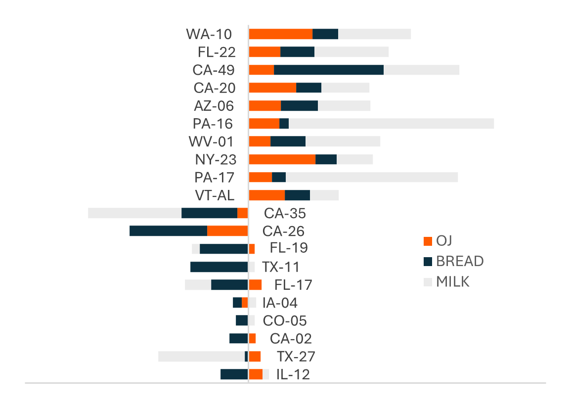Inflation of consumer staples across congressional districts was often uncorrelated to SMB workforce growth. Washington’s 10th district and Florida’s 22nd both experienced relatively broad price increases in milk, bread and orange juice while experiencing SMB workforce contraction in 2025.