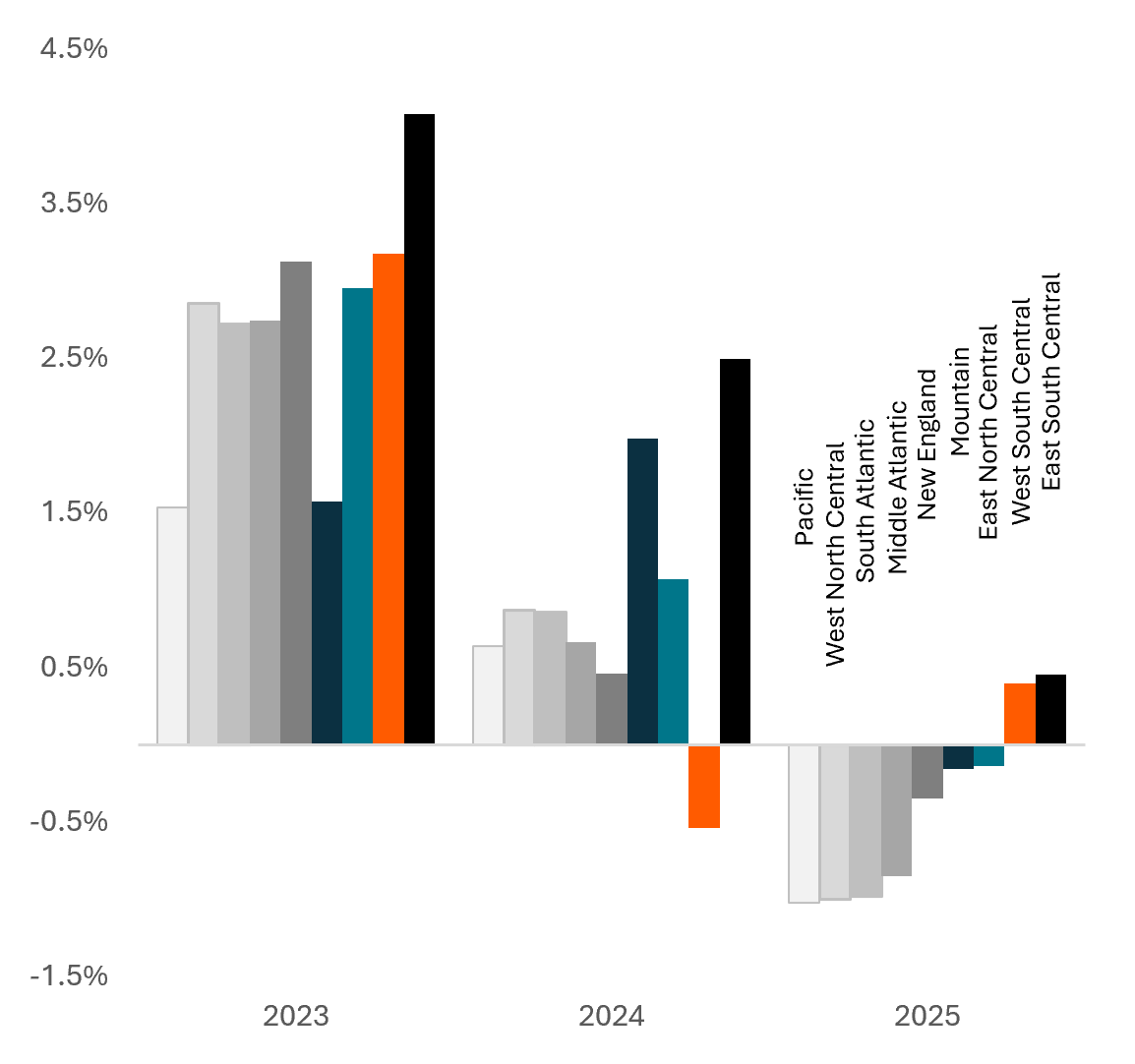 While the overall SMB workforce declined at the national level in 2025, central regions exhibited more supportive environments than those on either coast, led by the East and West South Central census divisions.