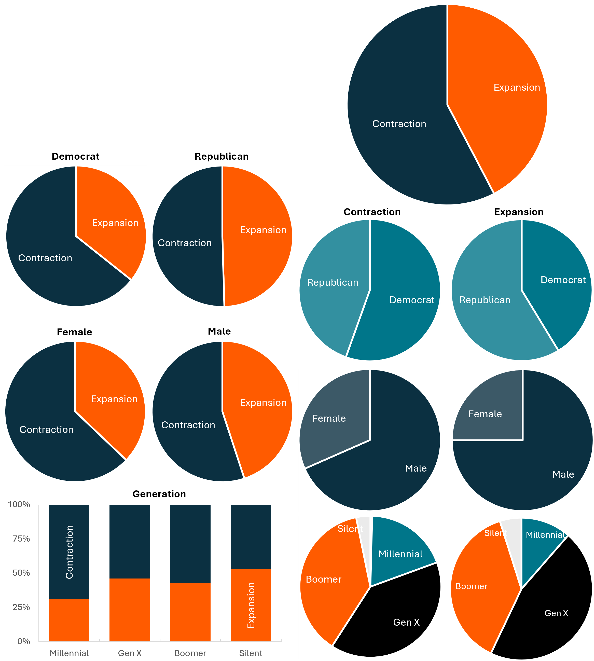 The following charts break down the demographics of U.S. representatives of congressional districts by expanding or contracting SMB workforces in 2025. Demographics include political affiliation, sex, and age, and the breakdown is by count of districts. While there were tendencies across districts, no single demographic had a majority of districts with expanding SMB workforces in 2025. These results are for informational purposes only and are not a statement of effectiveness or causation.