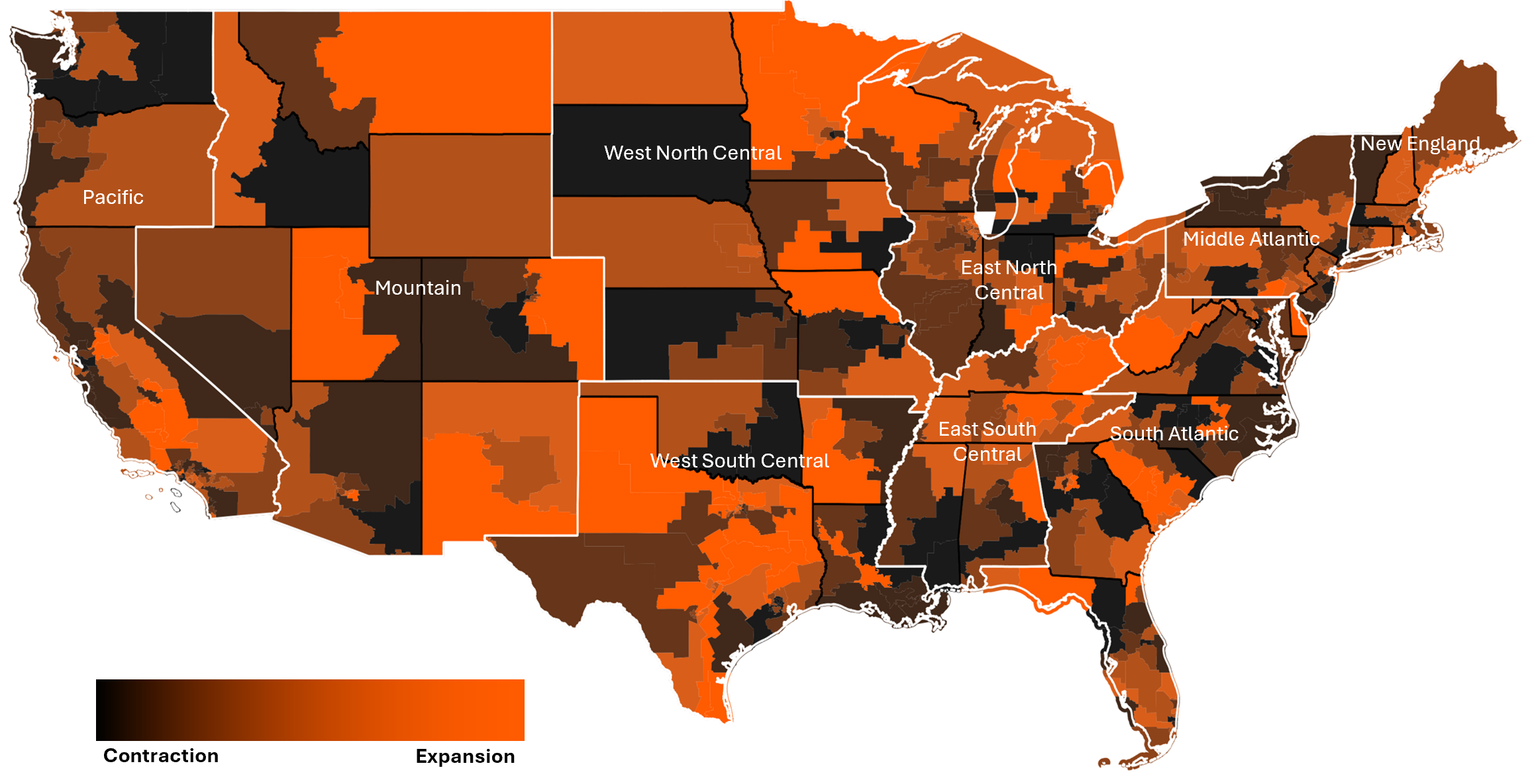 Exhibit 6: Choropleth of congressional districts color-coded by rates of SMB workforce expansion or contraction in 2025 with census division segmentation in white