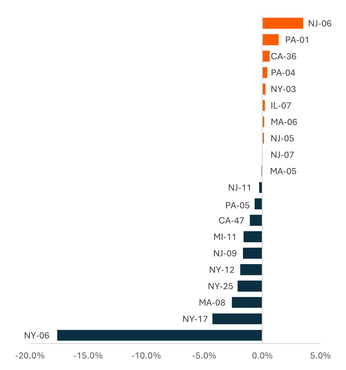 Among the congressional districts with the largest SMB workforces, New Jersey’s 6th district (NJ-06) had the largest workforce expansion in 2025. The district has experienced outsized SMB growth in recent years, which came with sharp increases in the proportion of new vehicle registrations, a measure of relative economic strength.