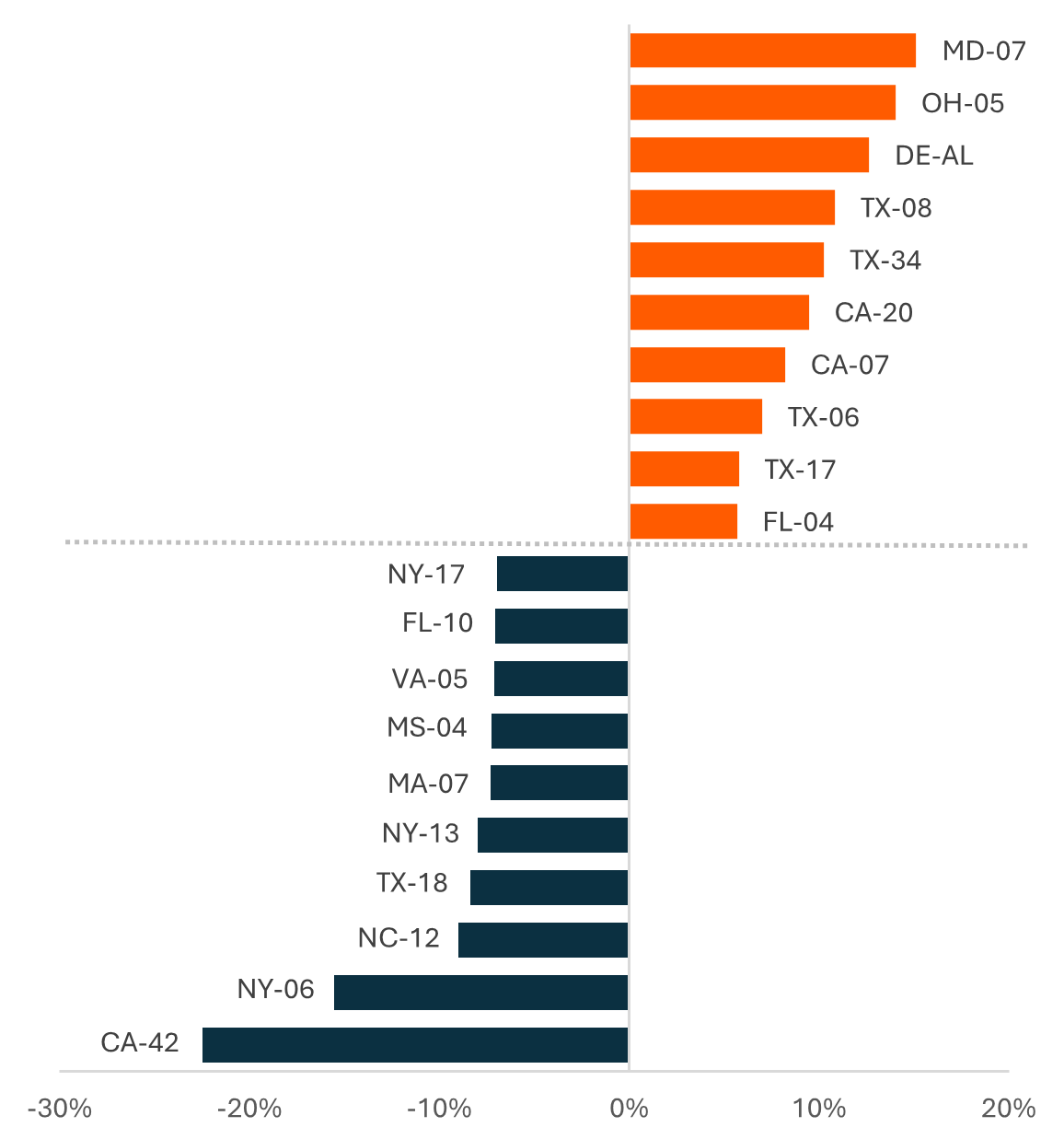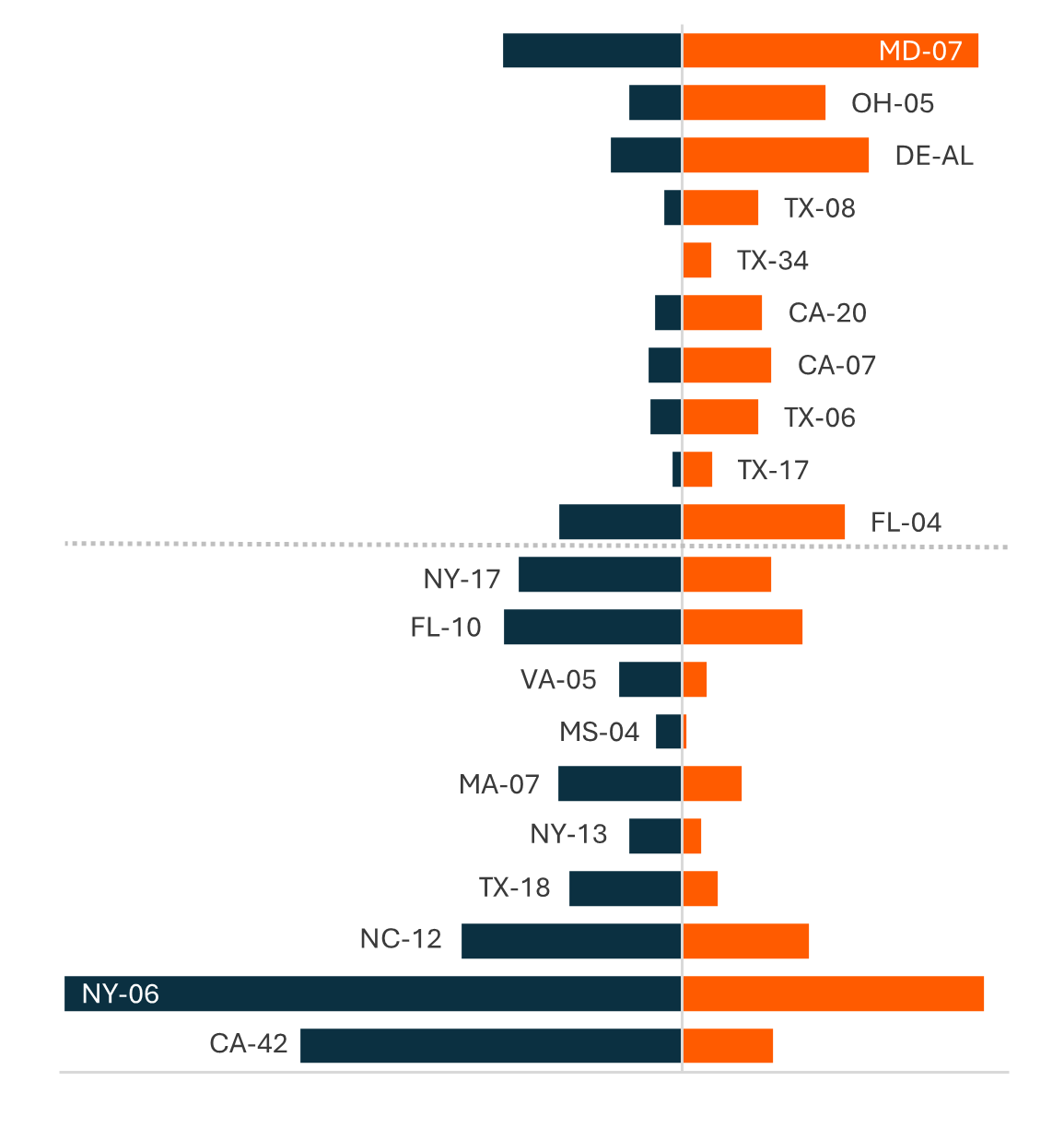 Exhibit 7 ranks the 20 congressional districts with the largest SMB workforces by their growth rates in 2025. Two points jump out, the majority of large districts contracted in 2025, and the rates of contraction were far greater than expansion.