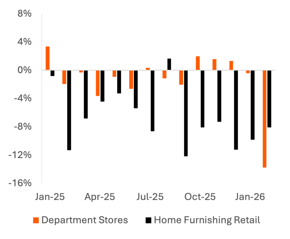 Cohort spend data at department stores and home furnishing stores, which includes retail brands like Crate & Barrel, shows a significant bias towards high-income consumers. 52% of spend at Home Furnishing Retail comes from consumers making $150,000 or more, and 65% from consumers making $100,000 or more. Spend at department stores, which also includes lower-cost consumer necessities like clothing, shows only slightly less bias towards the highest-income cohorts. These consumers have been cutting back spend; spend on home furnishings retail was down 8-12% in most months of 2025 and into early 2026.