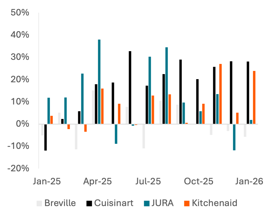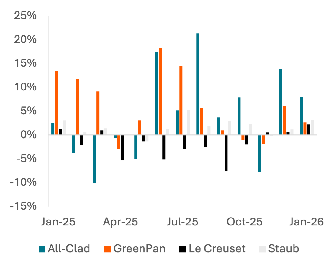 Waning consumer confidence is well-established by significant declines in spending on home furnishing retail and cutbacks in leisure spend, which were most emphatic early in the year before shifting negative towards the beginning of 2026. Spend in February is particularly weak but coincides with significant winter storms. Consumers have been trading down from Breville throughout the last year but largely from its less-expensive products, indicative of a K-shaped economy. Tariffs also show a strong impact on consumer behavior; as All-Clad and GreenPan raised prices in 2025, Le Creuset and Staub gained market share in cookware.
