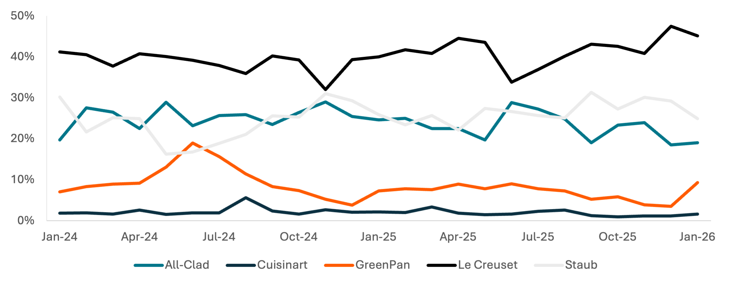 Market share improvement for Le Creuset and Staub, while slight, suggests consumers in cookware are responding to price increases by making substitutions, even if product functionality is not fully equivalent.