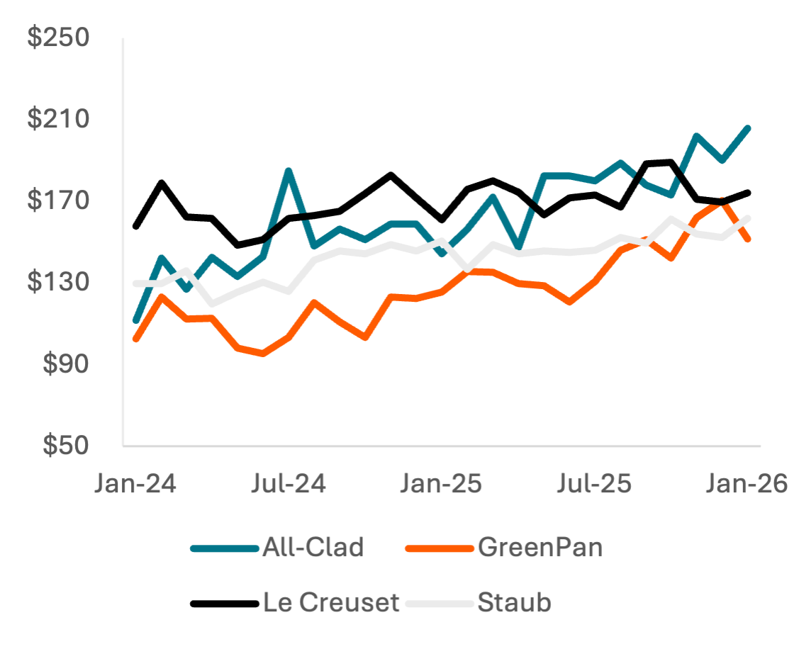 Market share of cookware brands is more stable, as the largest brands in the segment have similar pricing once in the consumer's cart; All-Clad SKU prices average to be more expensive than Le Creuset due to large, expensive cookware sets that are purchased less frequently than a singular pot or pan. All-Clad's share of units sold declined in 2025 as both average SKU prices and average purchase prices increased more-rapidly than the cast iron and Dutch ovens of Le Creuset and Staub; tariffs on France and Thailand, where Le Creuset and Staub manufacture products, are lower than tariffs on China.