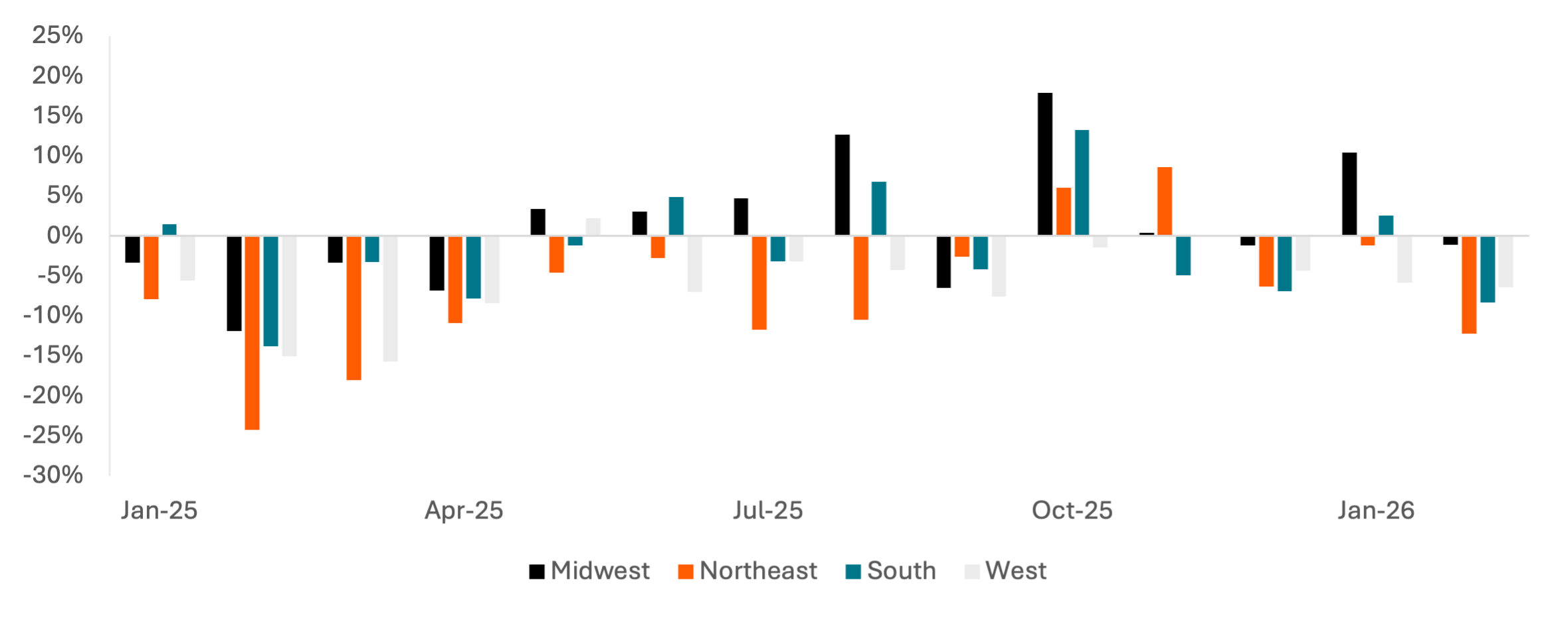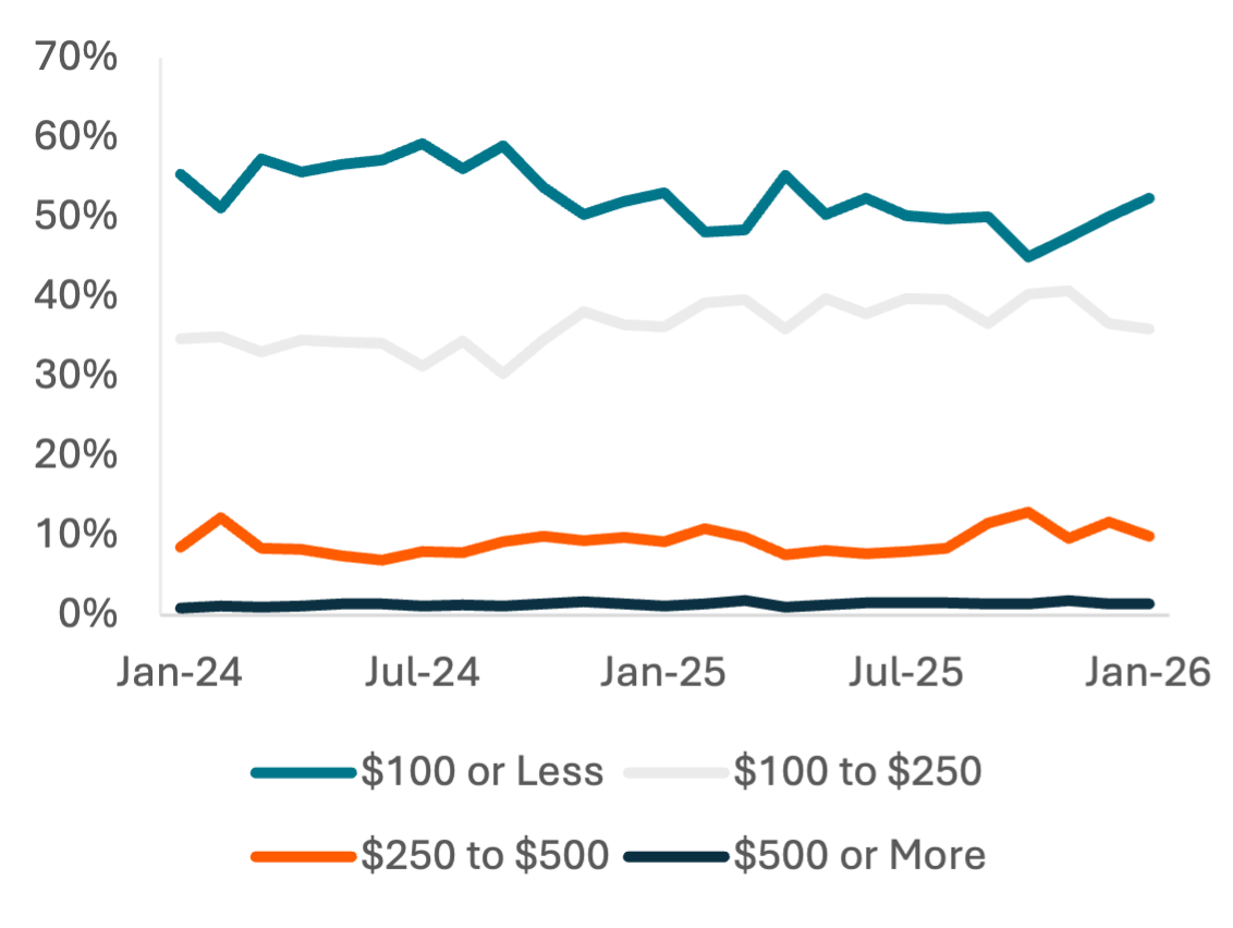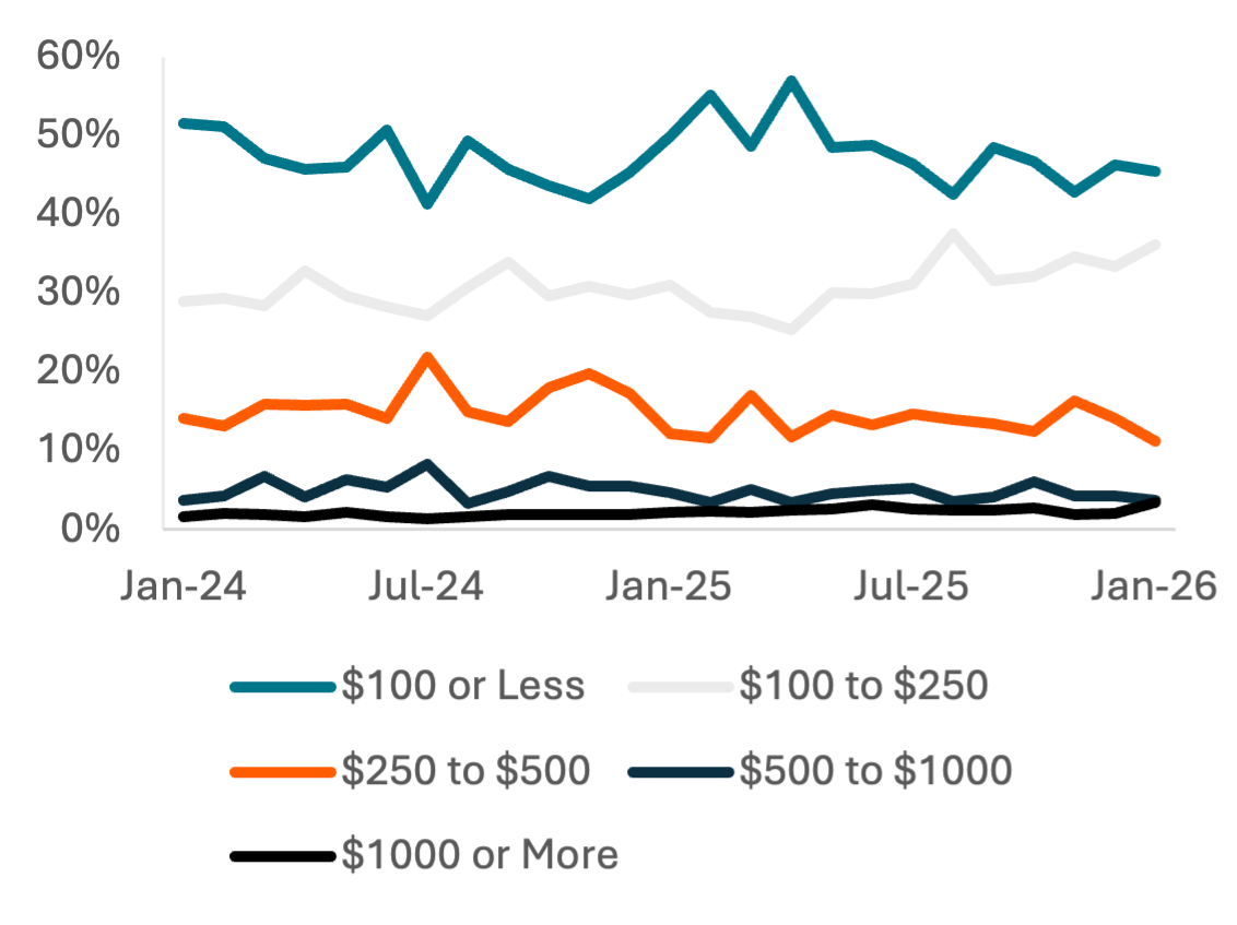 Carbon Arc's POS – Premium Culinary Retail dataset also provides insight into cooking classes, expanding insight into the leisure spend of consumers. Leisure spend fell across the U.S. during February, perhaps partially driven by major snowstorms, but spend in the Northeast has been weaker than any other region since January 2025. February, and to a lesser extent December, saw the weakest consumer spending on leisure since 1H25. That negative momentum is reflected in cooking class data, with spend on cooking classes growing significantly year-over-year in November and December before falling in January.