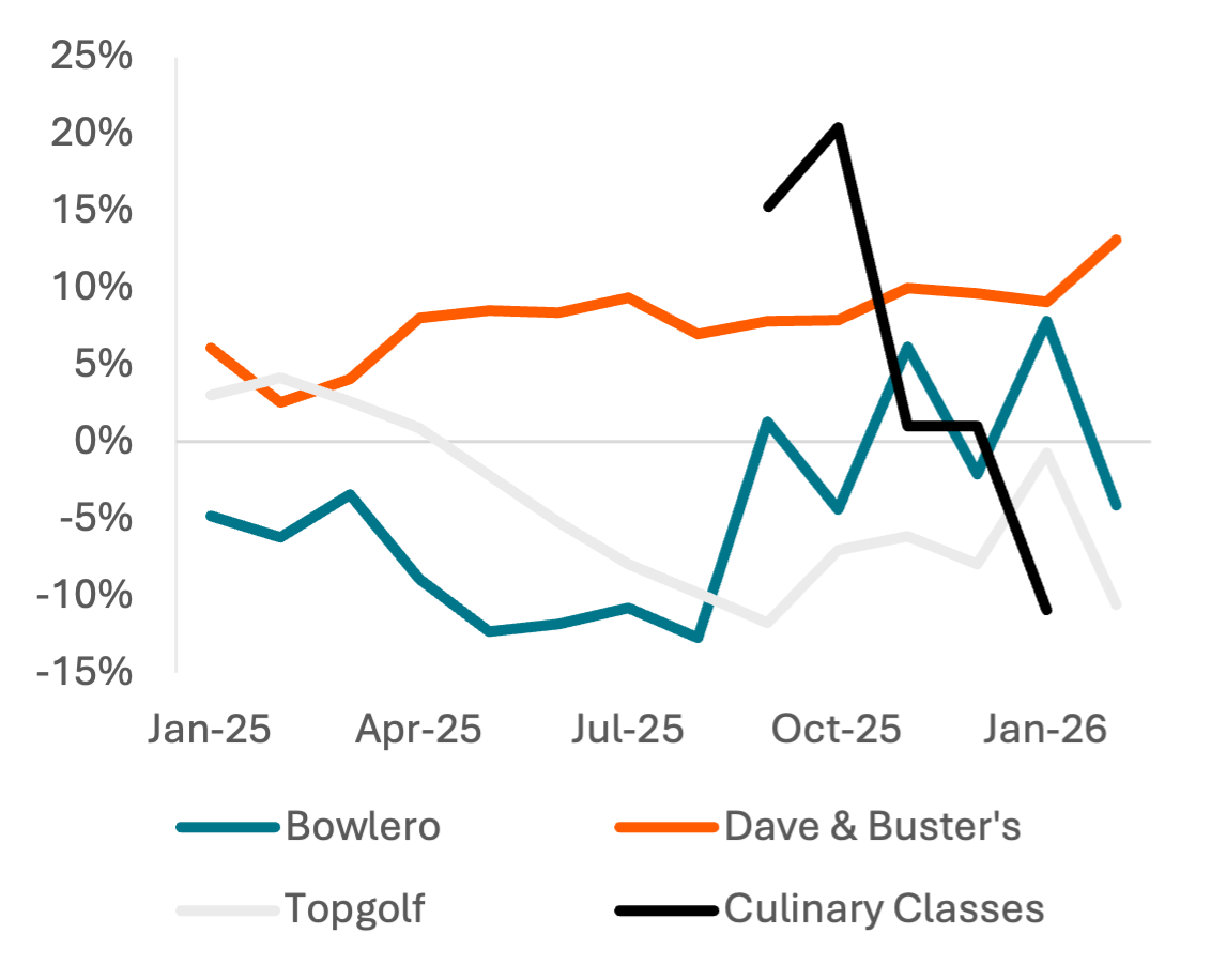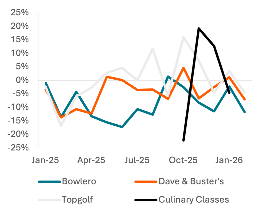 Consumer leisure spending showed a negative inflection in February 2026, against easy comps, to continue a weak winter. Card spend growth across leisure brands peaked in October 2025 but has stayed negative across brands since then. Data on culinary classes shows positive growth in November-December, but a similar negative inflection in January.