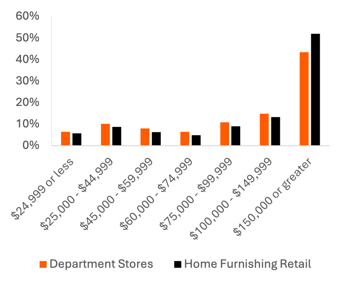 52% of spend on home furnishing retail and 43% of spend at department stores comes from consumers making $150,000 or more per year; consumers of high-end cookware are more likely to use LinkedIn and subscribe to smaller streaming services like Apple TV and Peacock.