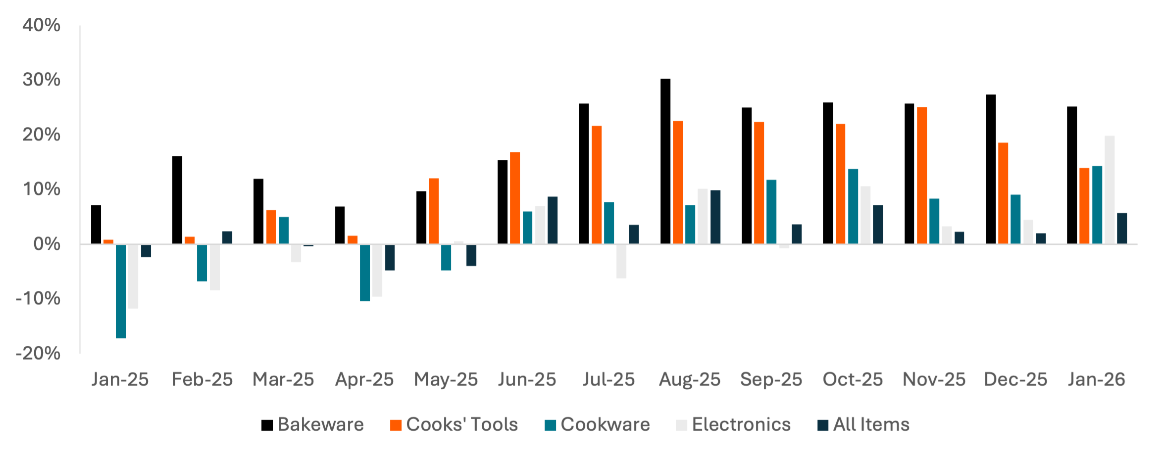 Average purchase prices for premium culinary products increased slightly year-over-year (Y/Y) in 2H25, peaking at 10% Y/Y in August. Prices for each major product category increased more-rapidly, however, indicating consumers are changing their product mix to lower-cost categories like bakeware and cooks' tools and away from larger cookware items and electronics (kitchen appliances). The greater purchase price increases for bakeware and cooks' tools could be driven by consumers used to purchasing higher-priced items bringing a larger budget to these lower-priced categories.