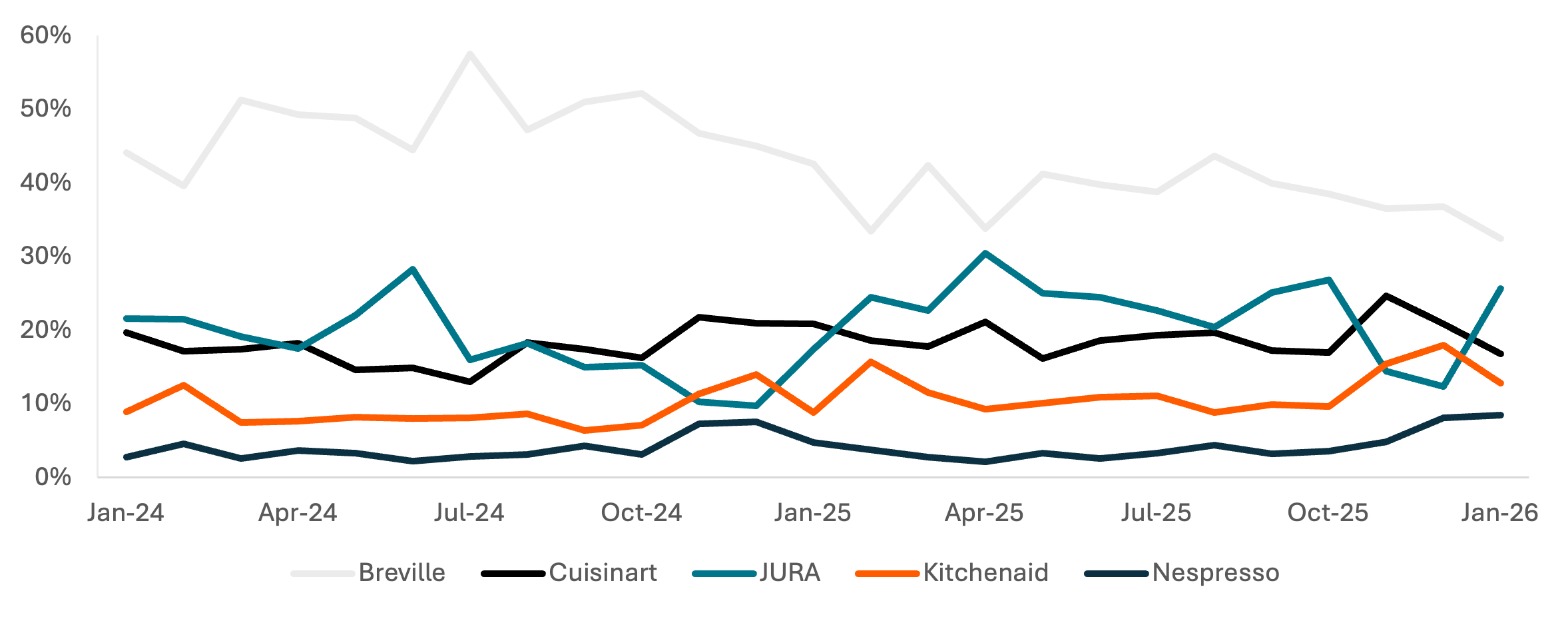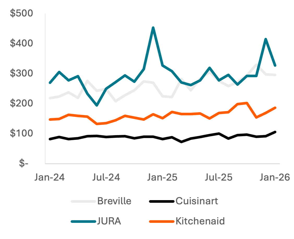 Nearly half of electric or "appliance" products sold in 2024 were made by Breville, but Breville lost market share to Kitchenaid, Cuisinart, and JURA in 2025. JURA and Breville are similarly-priced brands but the surge in popularity for Kitchenaid and Cuisinart indicates a desire to trade-down to more-affordable options. On average, Breville and Cuisinart lost a combined 4.6 pp of market share vs. 2024 in each month of 2025, with larger share losses at the height of "reciprocal tariffs" in the summer and during the holiday season.