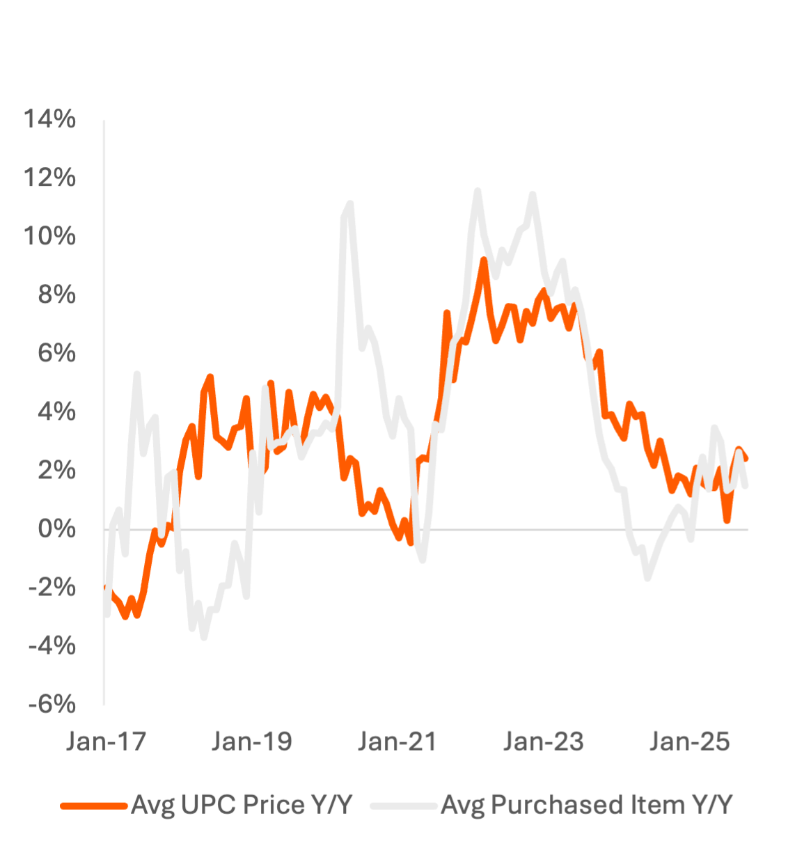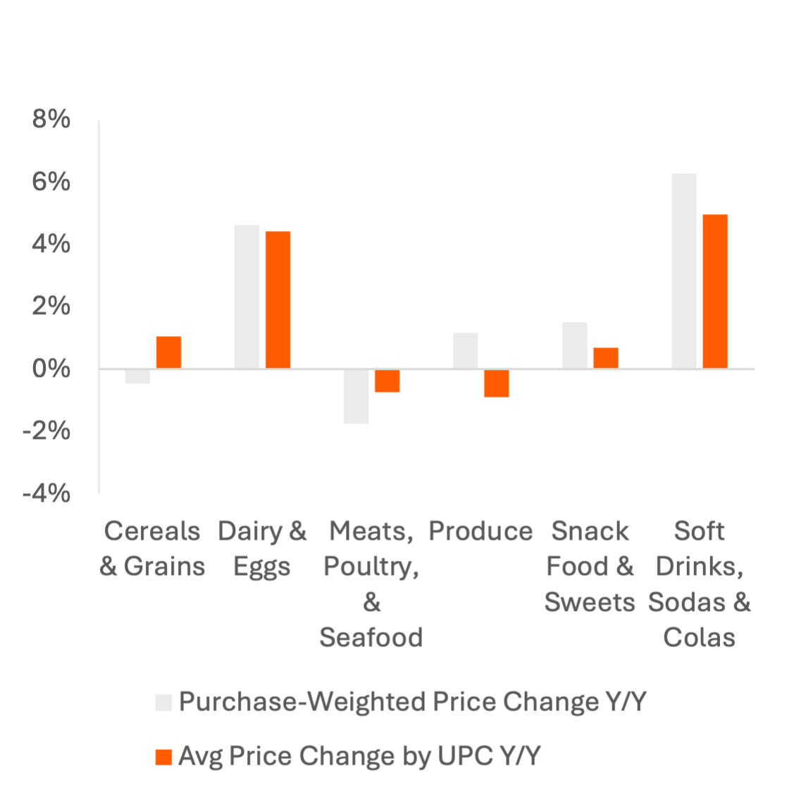 Exhibit 1: Y/Y Change in Avg Supermarket Price by UPC vs. Avg Price of Purchased Units