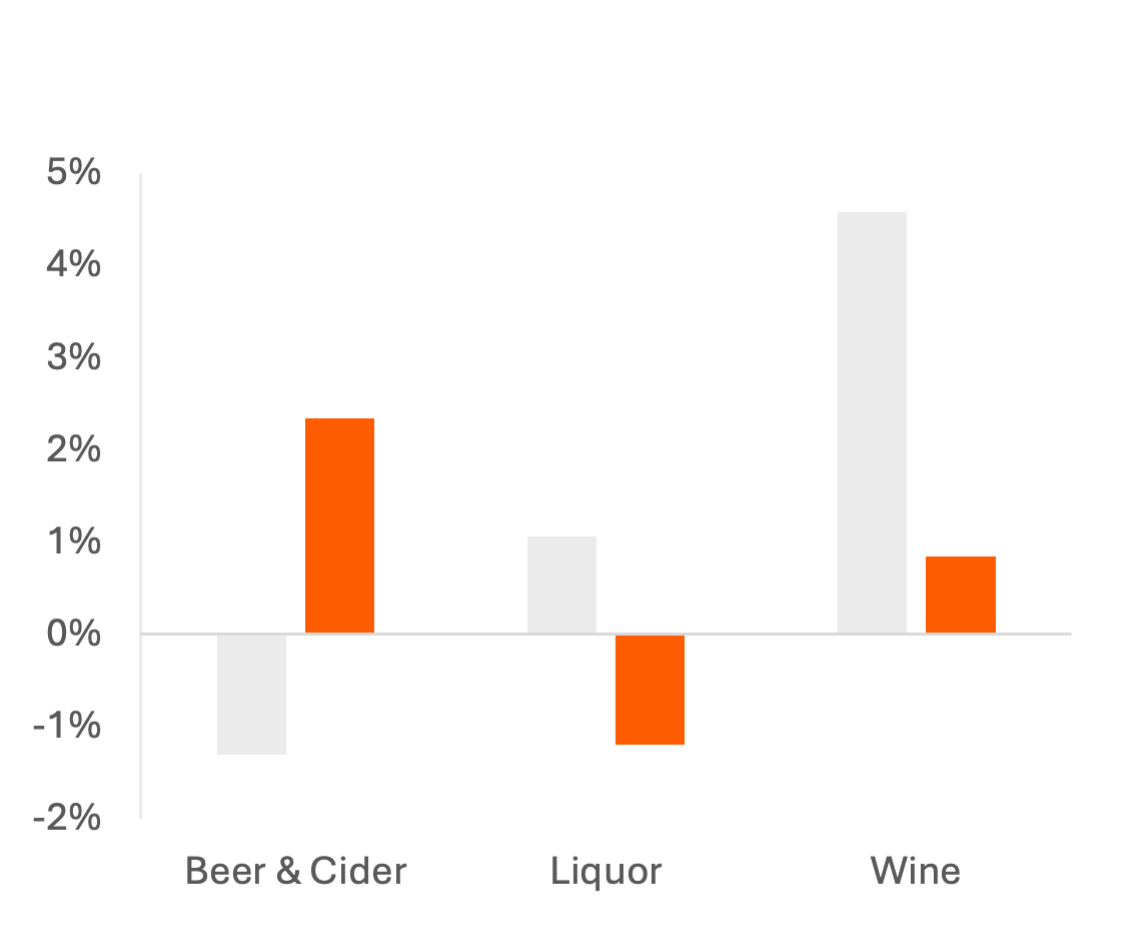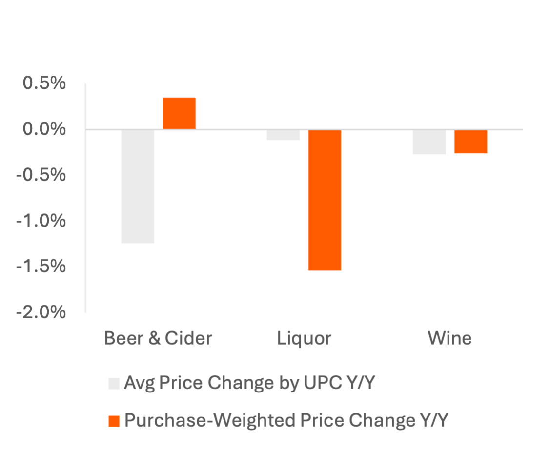 Prices are still down on average Y/Y in 2025, with beer & cider prices falling the most and liquor prices ~flat, which may reflect tariff impacts as wine and liquor are more likely to be imported, and bottled beer from Mexico is tariff-exempt via the USMCA. Consumers are still buying more expensive beers or larger pack sizes but cutting back within liquor purchases, possibly trading down to smaller bottles.