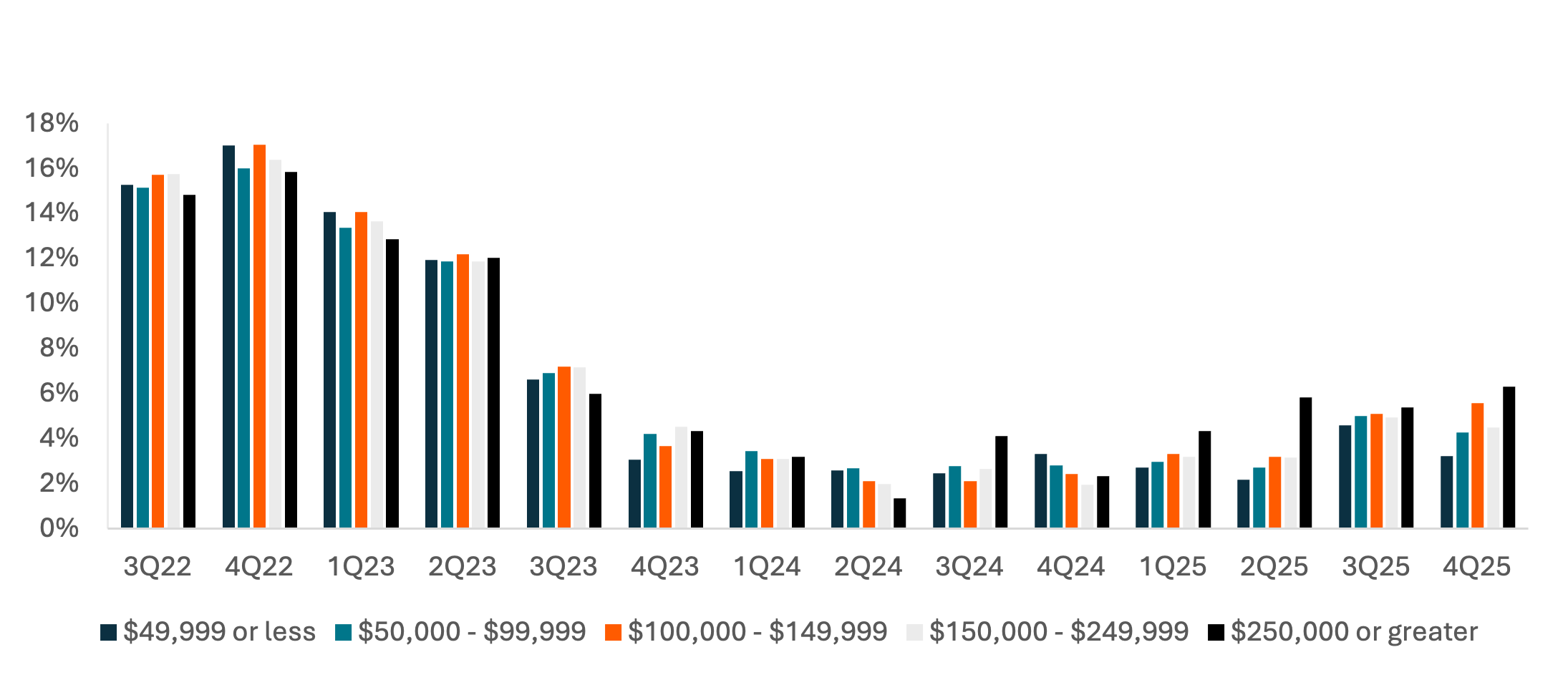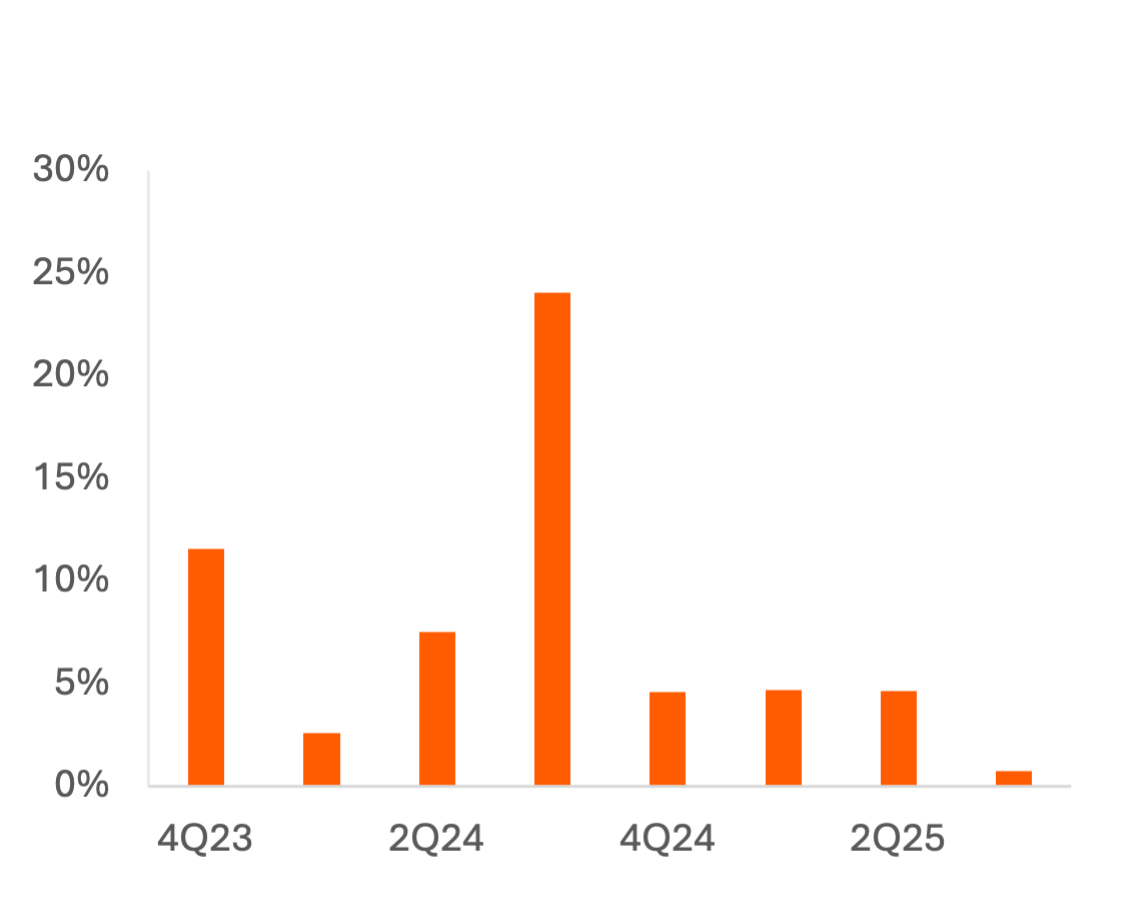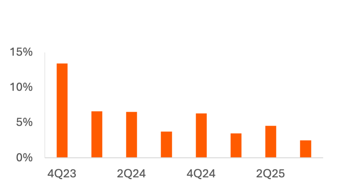Income cohorts at mass merchandisers suggest an emergence of “K-shaped” economic trends starting around 3Q24, as spend per item growth has been greater for the highest income cohort than for any other income cohort in 5 of the 6 quarters since. During earlier quarters when inflation was more prevalent, the highest-income cohort was increasing per-item spend the least, suggesting a greater usage of trade-downs. While the lowest-income cohort kept pace with other groups during 2023, perhaps due to wage increases during the pandemic, that cohort began to show greater weakness in 4Q23 and continues to increase per-item send at a slow rate.
