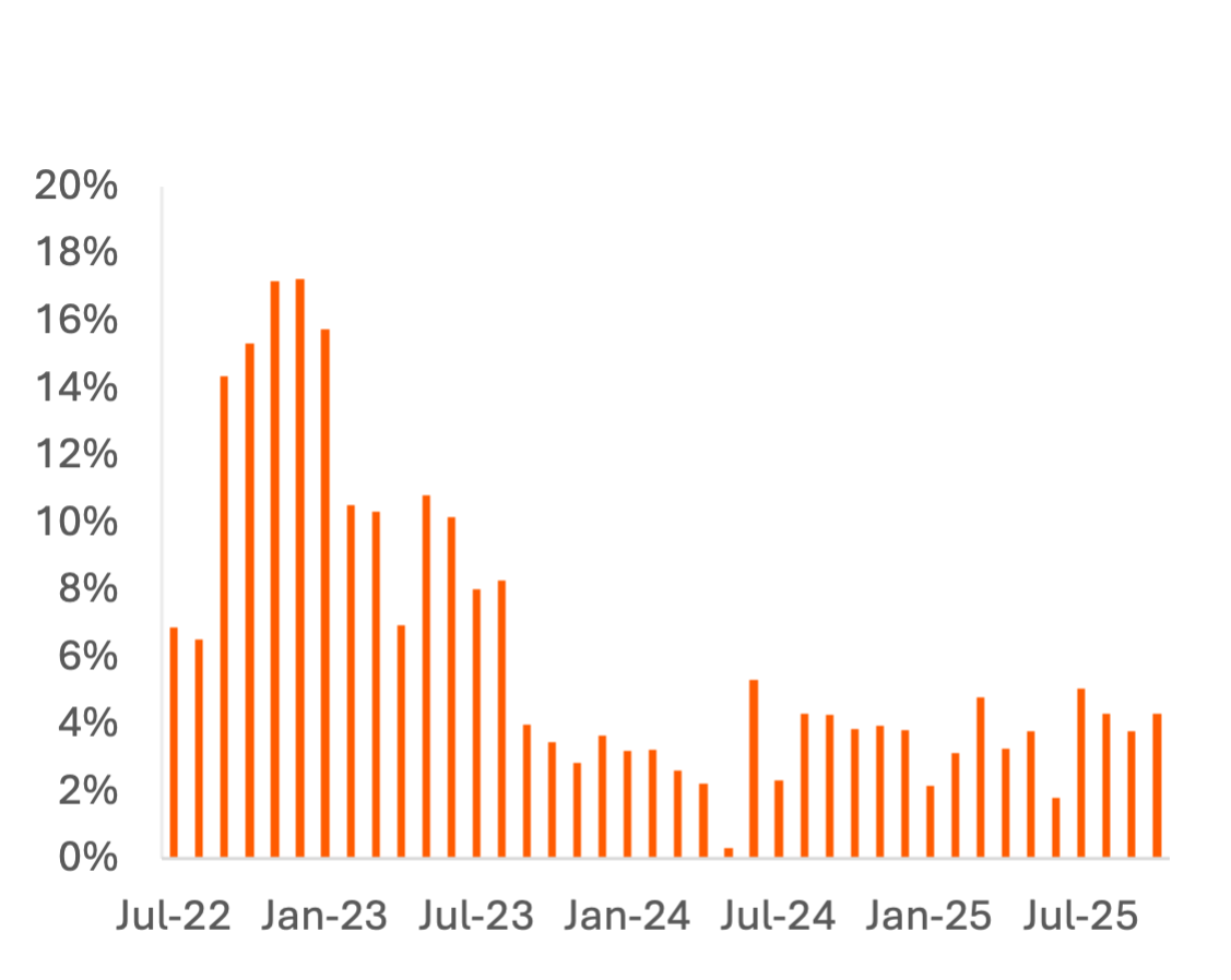 At restaurants, alcohol prices increased significantly from 4Q23 – 3Q24 and are growing at a similar pace to restaurant food in 2025, with 5% Y/Y growth in 1H25 decelerating to just 1% Y/Y in 3Q.