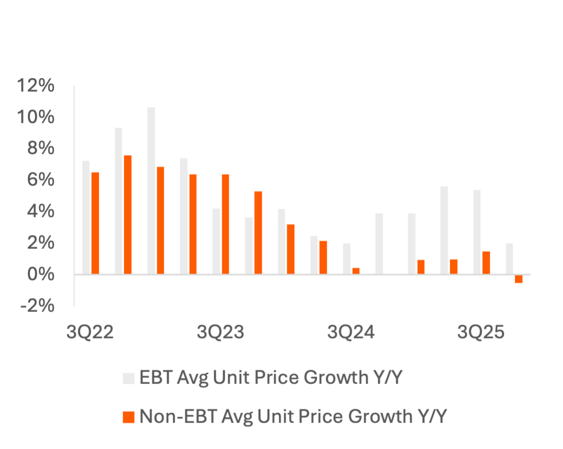 EBT users at convenience stores have increased spend per item by 2–6% Y/Y, compared with 0–2% growth among other payment users since 3Q24, including negative growth quarter-to-date.