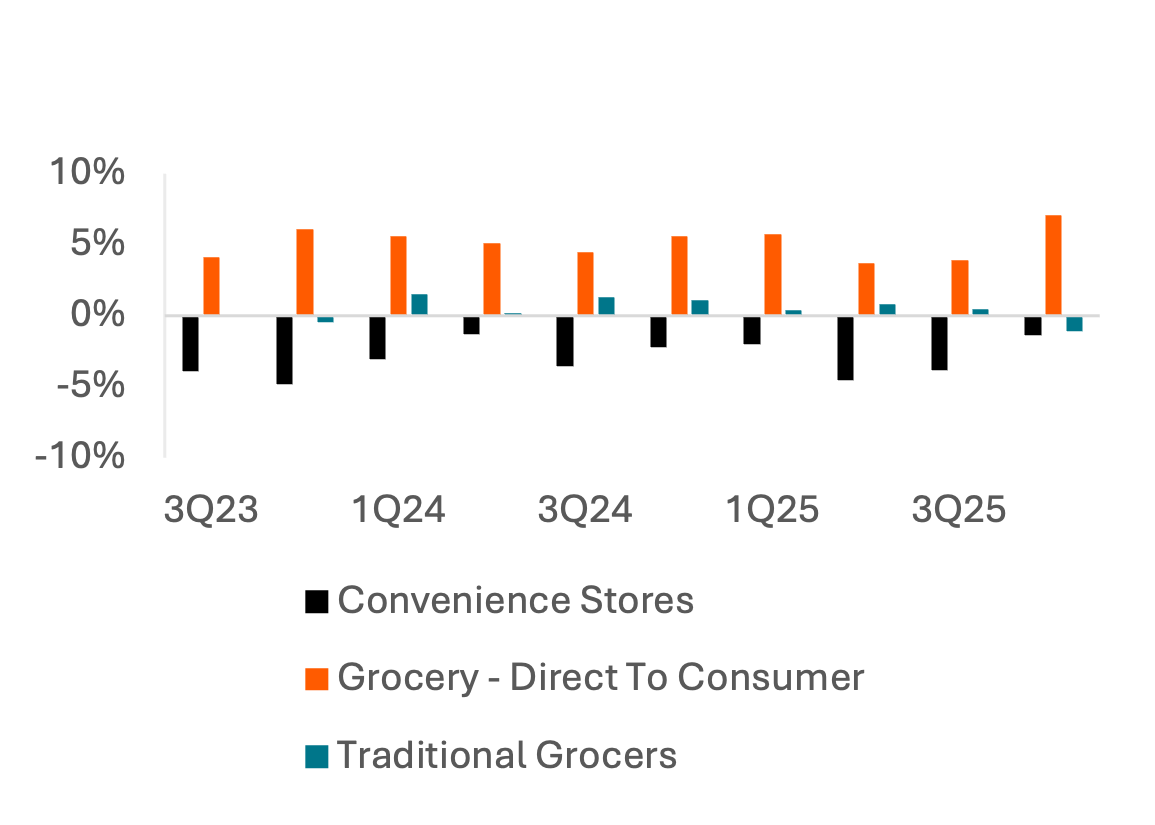 Even as per-item spend increased in 2023 and into 2024 and 2025, consumer card spend growth stayed ~flat to negative Y/Y at convenience stores and traditional grocers. Card spend per transaction levels for DTC grocery have grown at a consistent ~7% rate, suggesting time-saving activities are more insulated from trade-downs in transaction value.