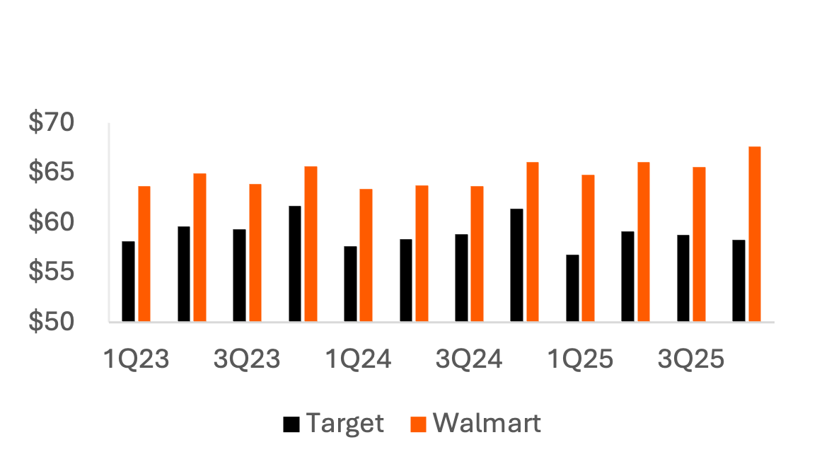 Card spend at mass merchandisers shows that despite continued per-item spend growth, consumers are not spending more on trips to Target, but average transaction value at Walmart is increasing 2-3%, suggesting its shoppers are more willing to maintain a full cart despite rising prices.
