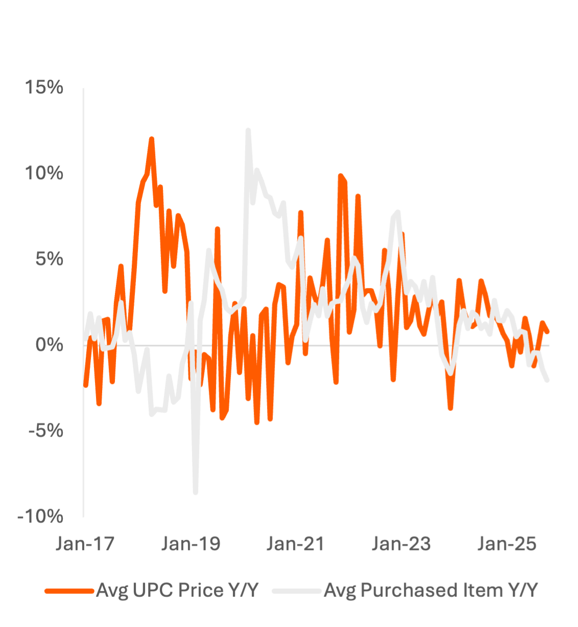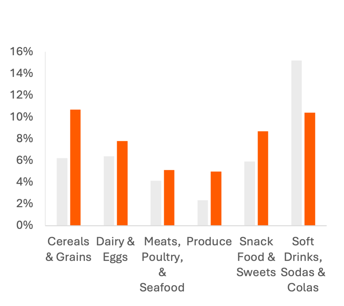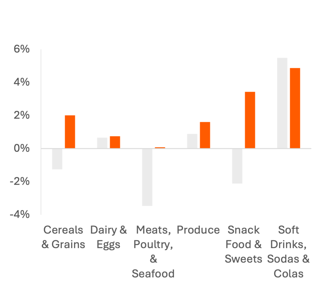 In Cereals & Grains and Snack Food & Sweets, consumers are trading down, lowering the average price of items purchased. Consumers buying larger snack food items in 2025, reversing trends from 2023 and 2024 may be a contrarian signal to the rise of GLP-1s or a shift to healthier and more-expensive brands.