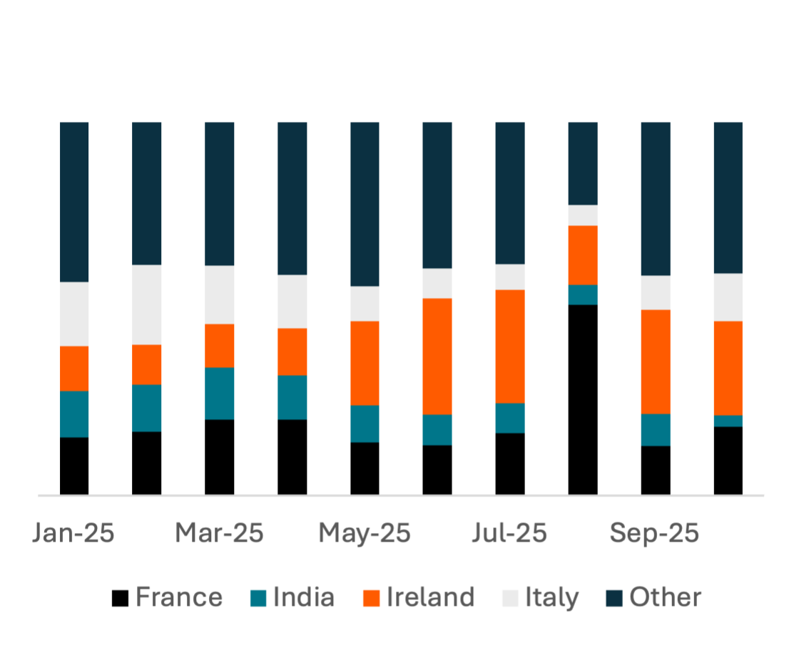 Dairy imports primarily come from the EU and India (90% of Indian imports are honey, which is included in the same HS category). The share of imports from India has shrunk in the last 3 months, suggesting a possibility that rising tariffs are redirecting supply chains in honey. Imports from the EU have been relatively consistent, which could reflect a premium product high-end consumers are still willing to pay for or a greater monopoly on supply chains in categories like cheese.