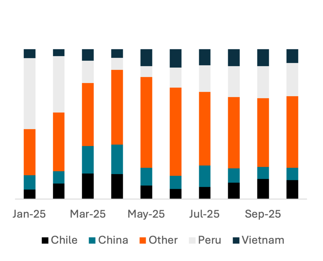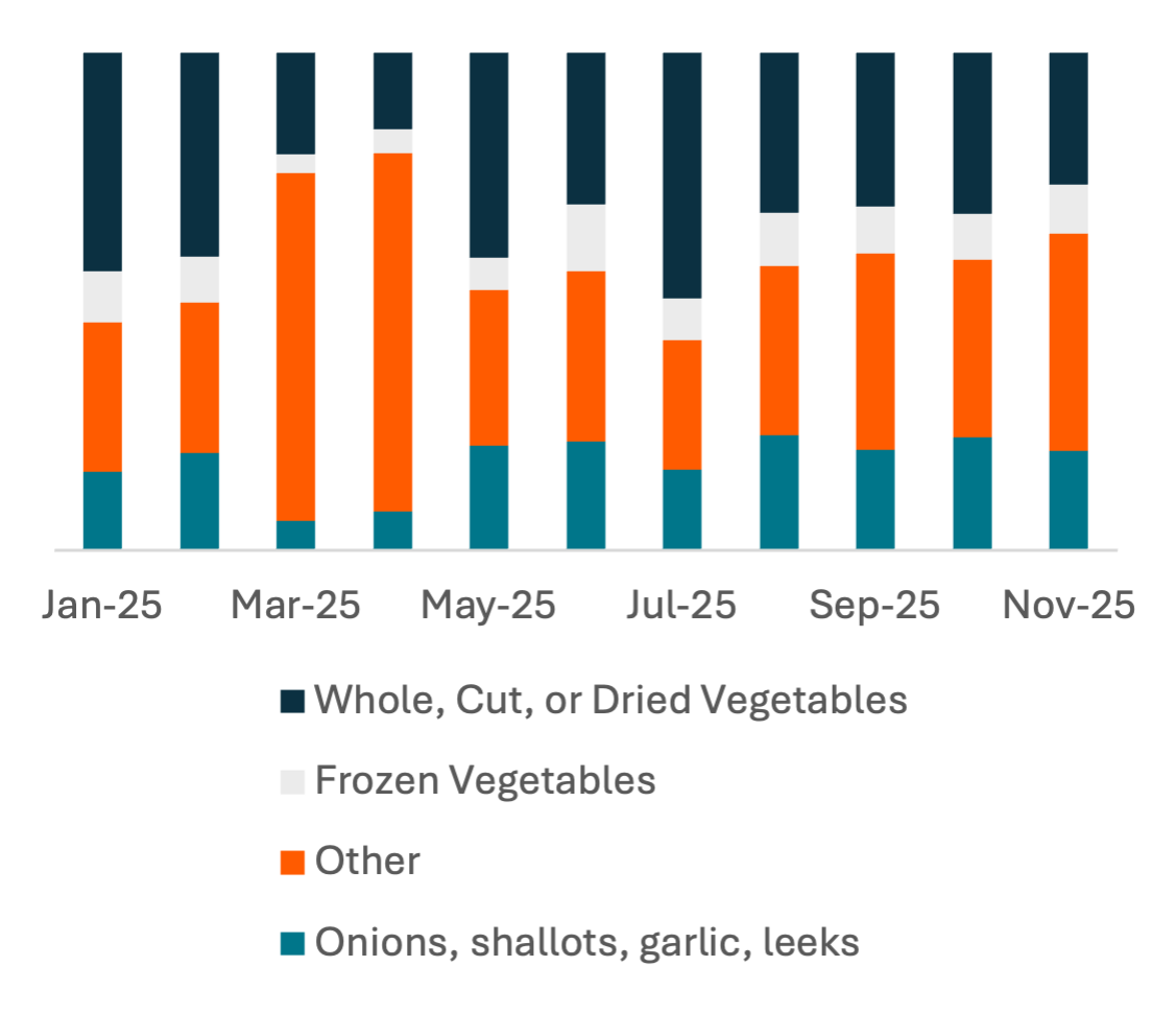 In produce, the supply chain is heavily distributed, but China is one of the largest sources of goods, primarily fresh or frozen vegetables rather than fruit. The share of produce imports from China and Vietnam rose in the period around Liberation Day and has stayed above the levels seen in January/February, suggesting tariffs may be directly impacting profitability and pricing rather than rerouting supply chains.