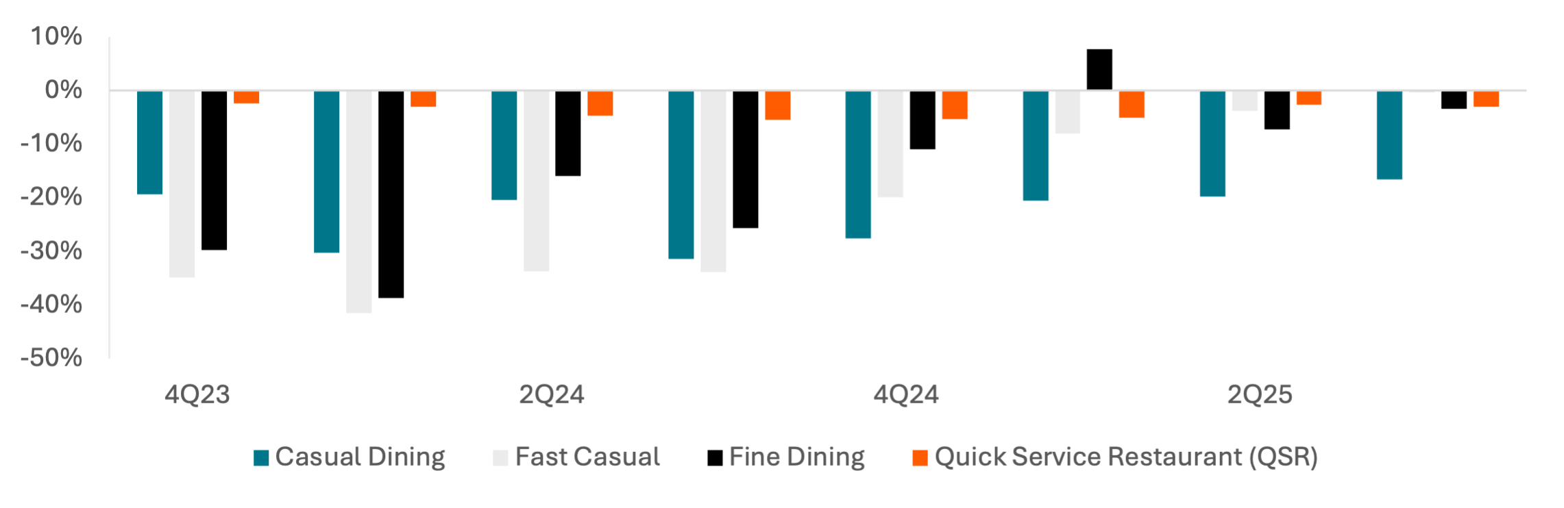 In Fine Dining, consumers are spending less per visit but maintaining visit frequency, while in Casual Dining, they are spending more per visit but going less often.