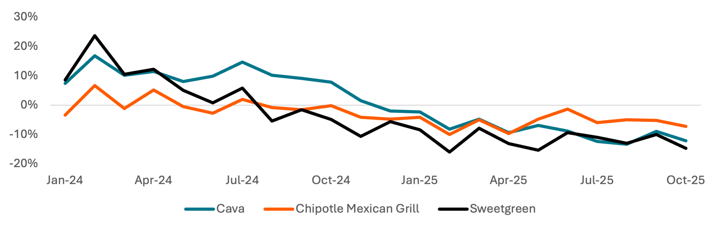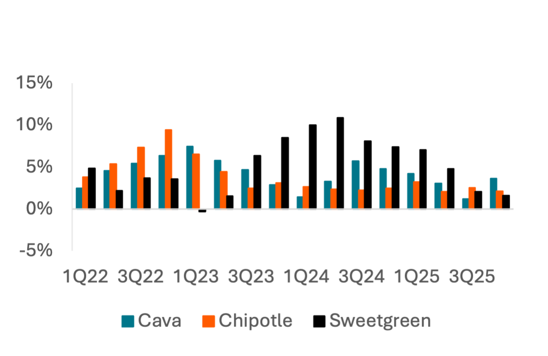 Bowl-based Fast Casual brands Cava and Sweetgreen have seen transaction value growth outpace the QSR categories and Fast Casual categories over the past 6 quarters. Sweetgreen grew transaction value ~10% Y/Y in 2023-2024 but trails both Cava and Chipotle in transaction growth. All three platforms saw spend decelerate in October, though Chipotle’s inflection was more modest.