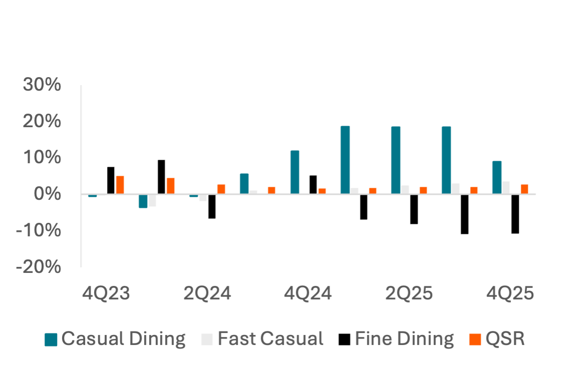Scraped restaurant menus from Carbon Arc’s Menu Data Asset indicate that following an average item price increase of 13% between 4Q22 and 4Q23, price growth has steadily decelerated to 2.5% average growth in 3Q25, much more in-line with overall inflation numbers. Consumer transaction value growth of ~2% Y/Y from 2Q24 – 3Q25 did not keep up with the 3-6% average price increase of menu items, but QSR transaction values are up 2.7% Y/Y in 4QTD, indicating a possibility that transaction value growth is fully catching up to pricing growth.