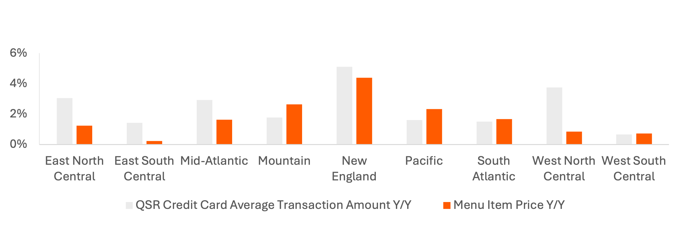 In 3Q25, item prices and transaction values both grew the most Y/Y in New England. After New England, item prices grew the most in the Mountain and Pacific census regions, and the least in the Central regions. Transaction amount growth heavily outgrew menu price increases in three of the Central regions.