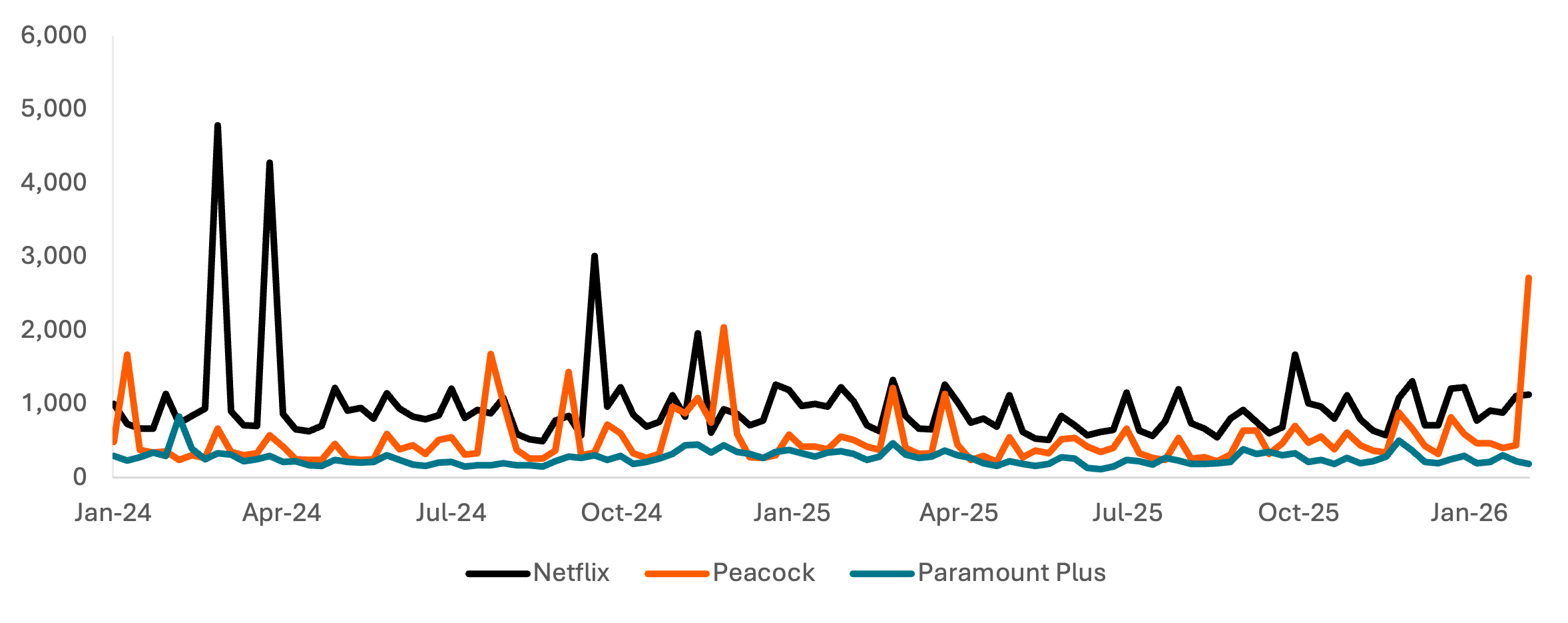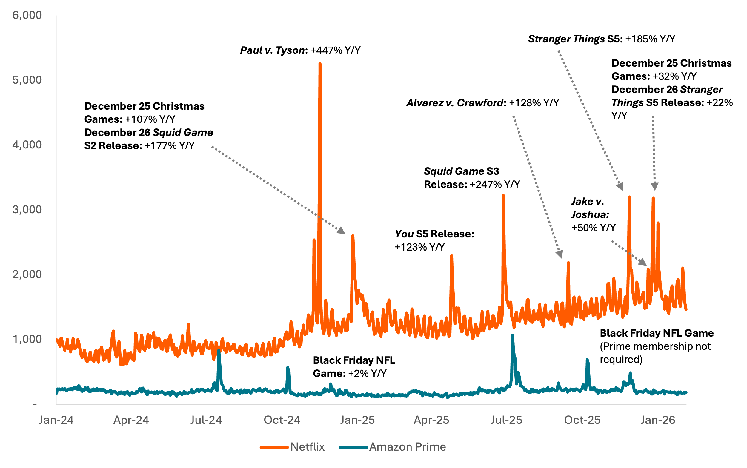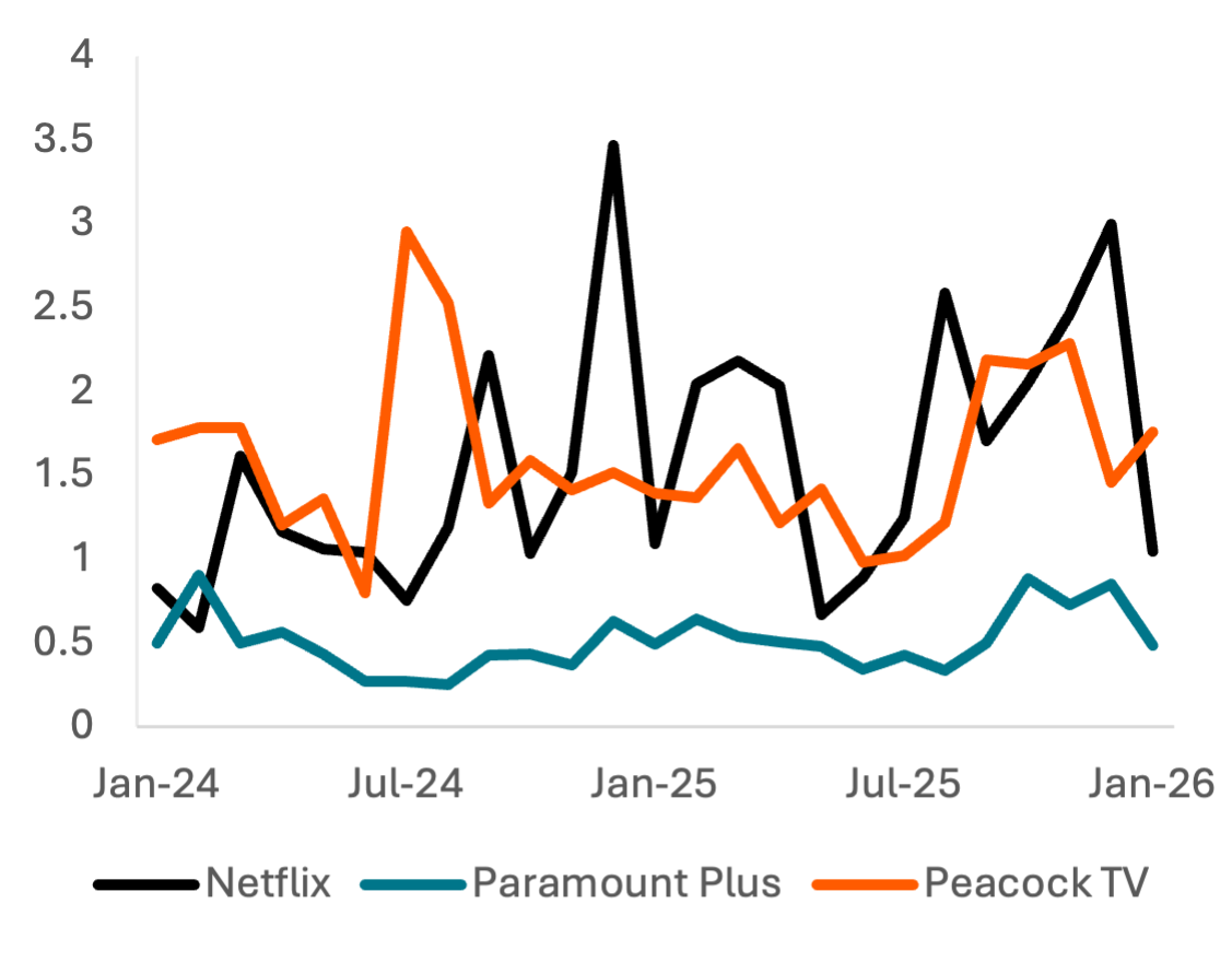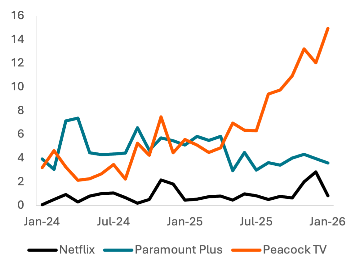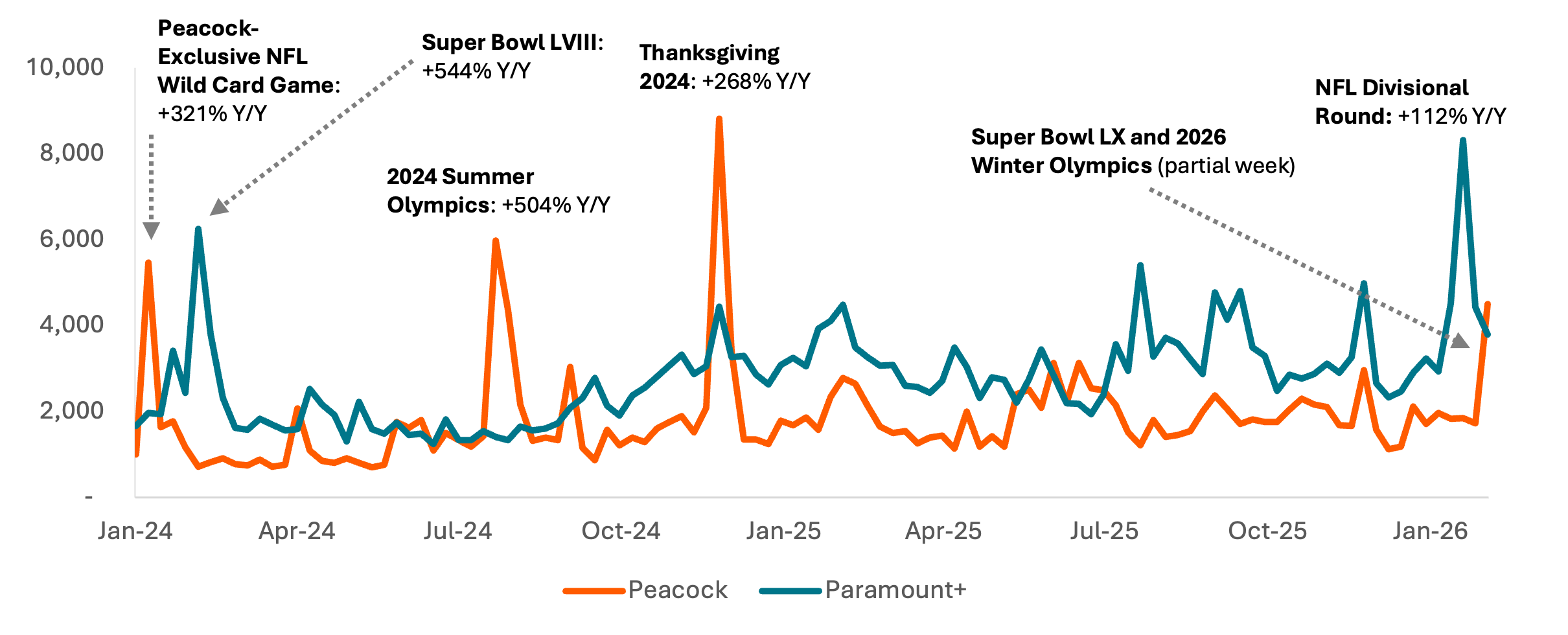 Peacock shows much more consistent activation of viewers for major sporting events, generating greater than 100% Y/Y growth in web traffic to its sign-up page for an exclusive NFL Wild Card Game but also for the Summer Olympics and NBC’s Thanksgiving slate, which were available through traditional television. Subscriber visits corresponded to increased U.S. credit card activations across these events, with activity in the week of the Super Bowl exceeding Netflix’s new additions for Paul v. Tyson.