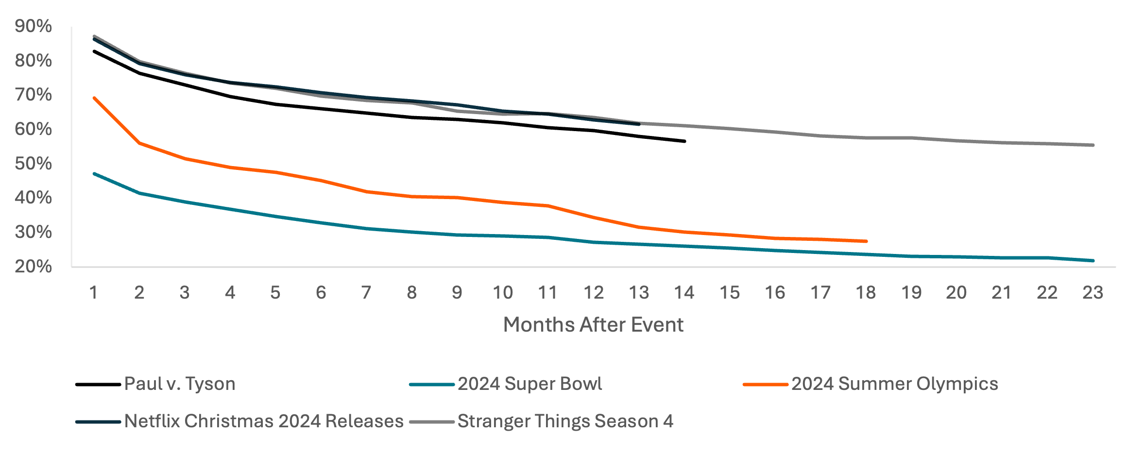 Despite lower U.S. subscription activation for Paul v. Tyson and later live events, 83% of users who joined Netflix at the time of those events renewed their subscription at least once, and the retention curve is stabilizing at 50-60% of the users who joined, just below the retention for Stranger Things Season 4. Fewer than 70% of the viewers who subscribed to Paramount+ for Super Bowl LVIII (2024) or to Peacock for the 2024 Summer Olympics stayed on for the following period, with less than 50% of Paramount+ users staying on after the Super Bowl.