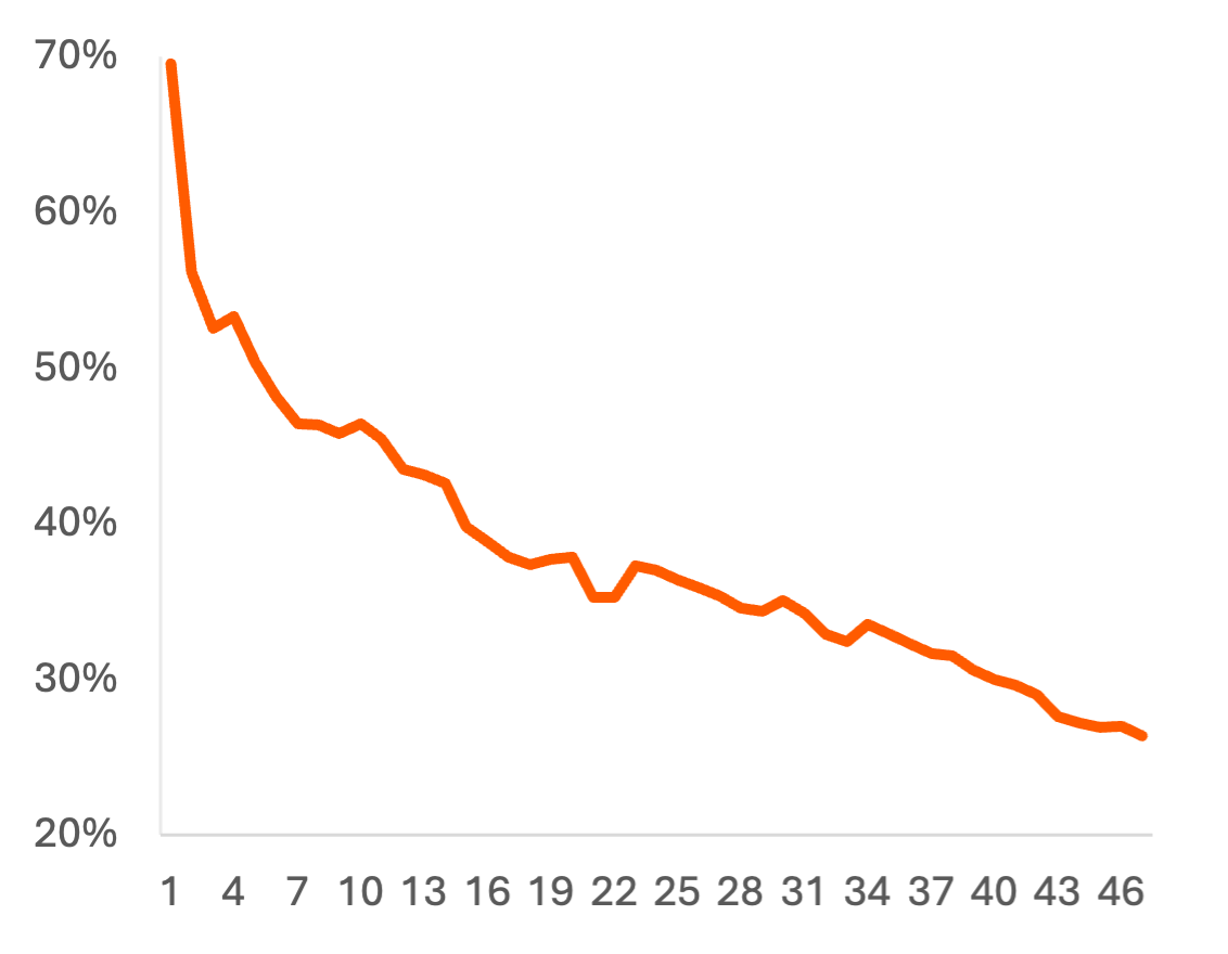 Netflix’s live sports cohorts outperform Peacock and Paramount+ and perform nearly as well as its Stranger Things Season 4 cohort in customer retention, highlighting the opportunity posed by this new customer vertical. Peacock’s Summer Olympics cohort fares poorly, but its 2022 Super Bowl and Winter Olympics cohort had stronger long-term performance after a weak first month.