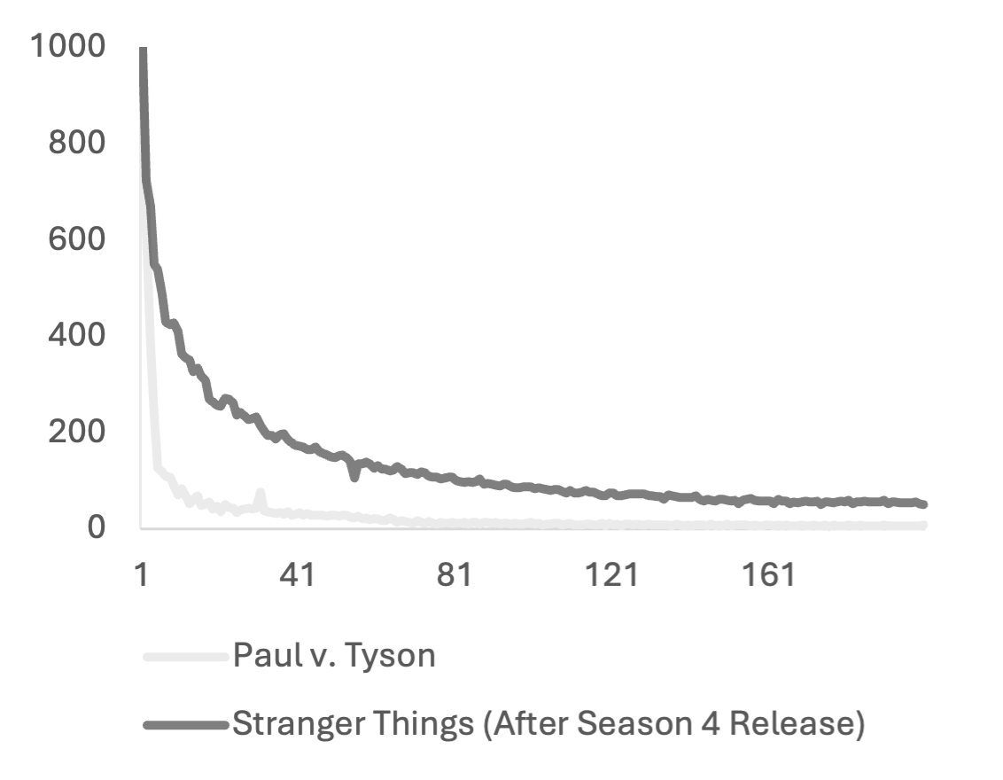 The Paul v. Tyson cohort’s nearly as strong retention than the cohort of viewers who subscribed for Stranger Things Season 4 suggests live sports viewers may offer a better ROI to Netflix than show-based viewers who are still not among Netflix’s 325 million subscribers.