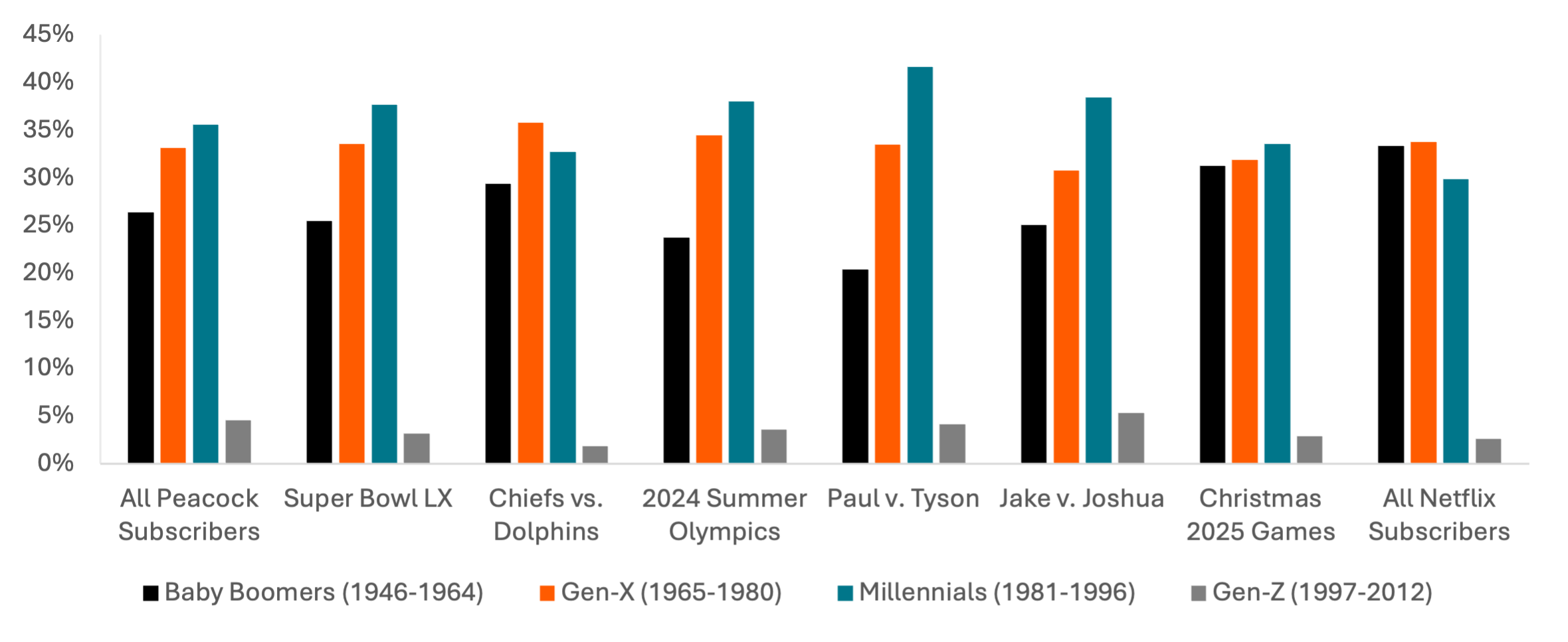 Demographic data shows that greater popularity of Paul v. Tyson and Jake v. Joshua among Millennials, who make up a smaller share of Netflix’s customer base. The Super Bowl LX and 2024 Summer Olympics subscribers also skewed more Millennial than Peacock’s subscriber base, though the cohort for other NFL games across both platforms skews towards Baby Boomers and Gen-X. Because Netflix’s customer base already skews older, the lower Millennial engagement with later sporting events may be driving the failure to replicate Paul v. Tyson.